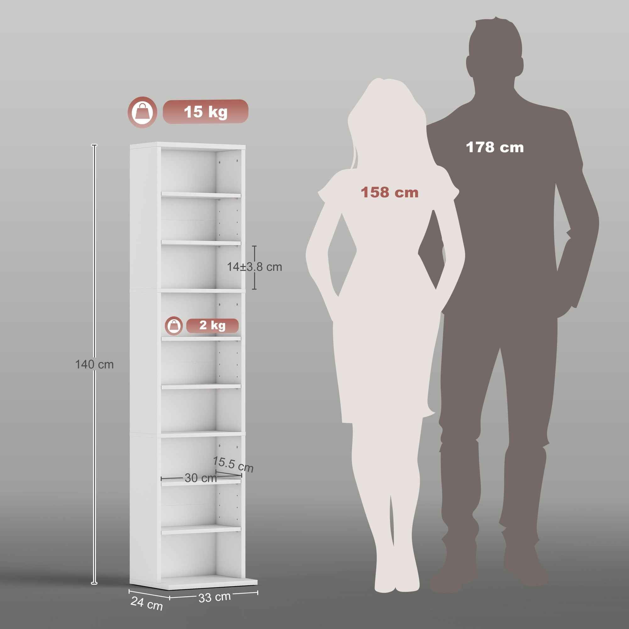 Update your living room or office space with a HOMCOM bookcase. Featuring 9 total shelves, 6 of which are adjustable, the structure can hold up to 260 CDs or 120 DVDs. Thanks to a sturdy chipboard frame and an anti-tip strap, the furniture offers a reliable and stylish solution for any interior space, enriching your home decor in a modern and functional way. Features: • Our bookcase can hold up to 260 CDs on 9 total shelves • Remove and adjust the shelves of the CD rack to accommodate up to 120 DVDs or Blu-rays • The CD rack’s anti-tip strap increases the safety and stability of the structure • The reduced depth saves valuable floor space • The CD rack’s quality chipboard construction ensures durability, while the melamine surface makes cleaning easy • Easy to assemble with numbered parts and clear instructions. Technical data:• Colour: White• Material: Chipboard• Overall dimensions: 33W x 24D x 140H cm• Dimensions of each shelf: 30W x 15.5D x 14H cm• Storage capacity: 260 CDs/120 DVDs• Weight capacity: 15 kg (overall), 2 kg (each shelf)Package contents:• 1 x CD rack• 1 x Assembly manual