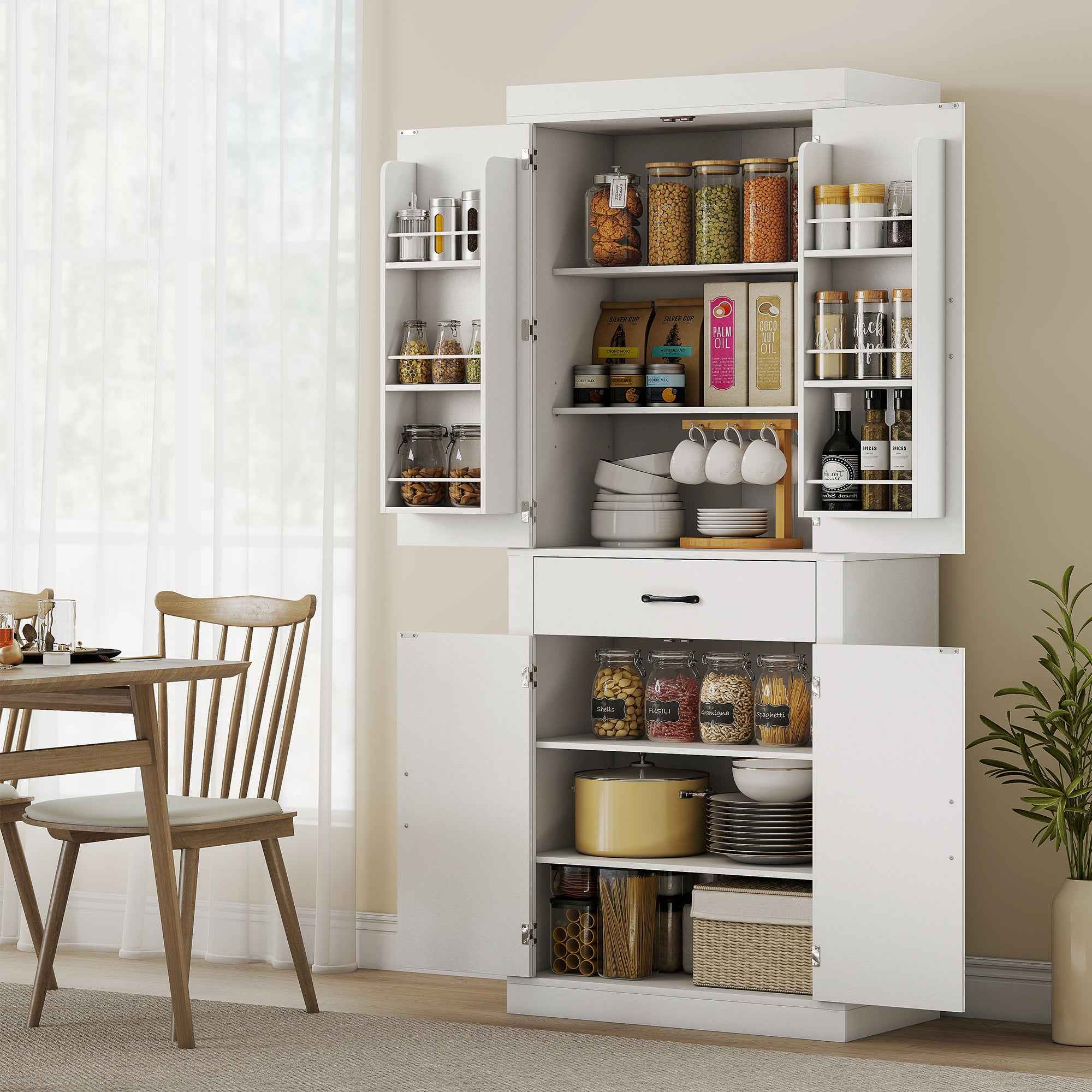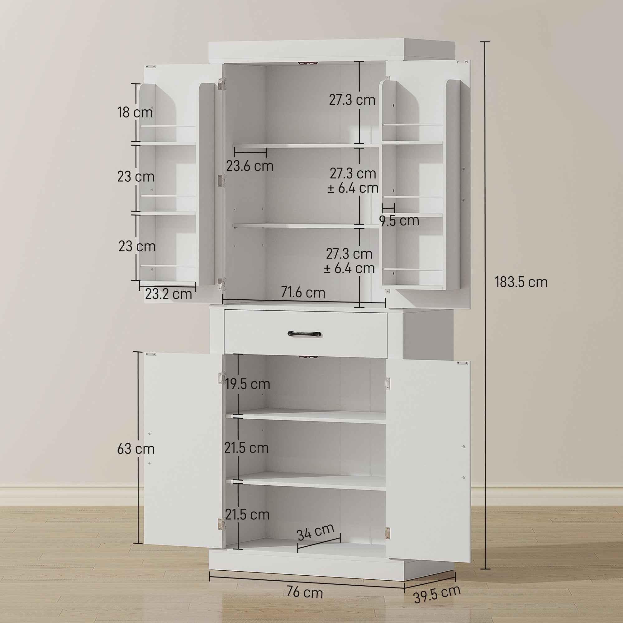 HOMCOM Country Style Kitchen Pantry with 2 Cabinets, 6 Shelves and Drawer, Wooden, 76×39.5×183.5 cm, White