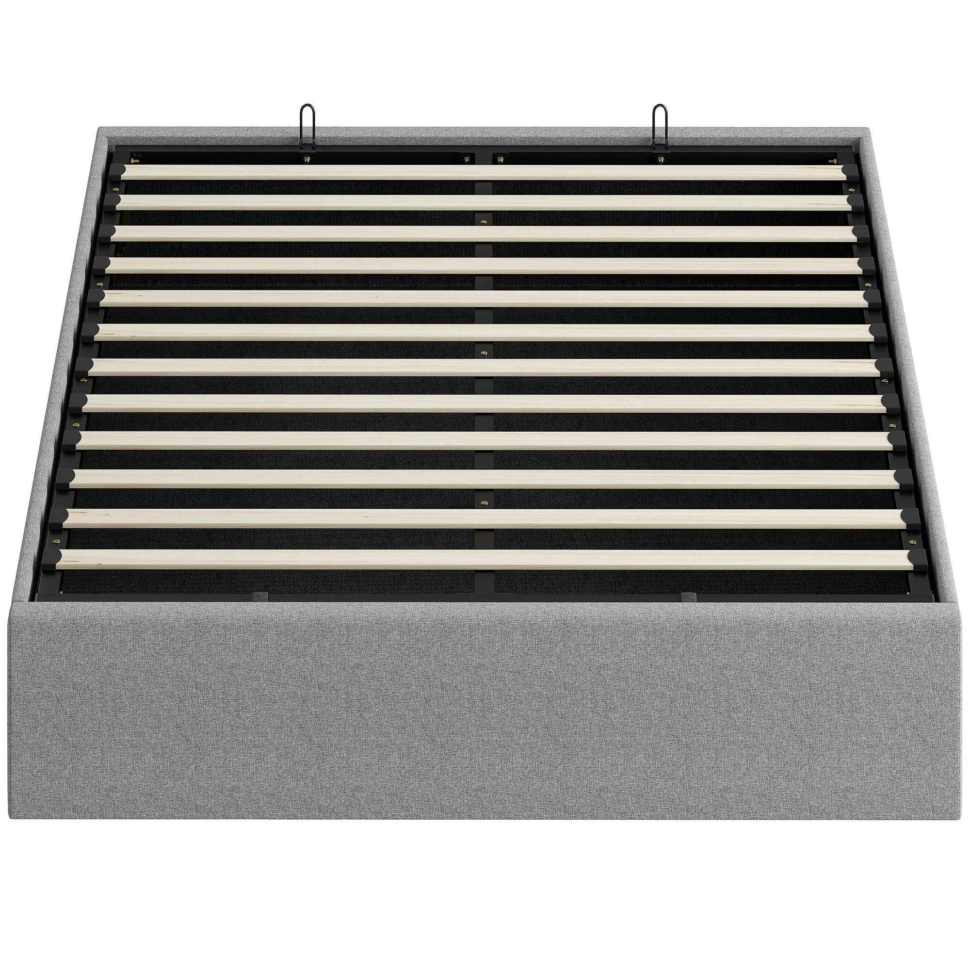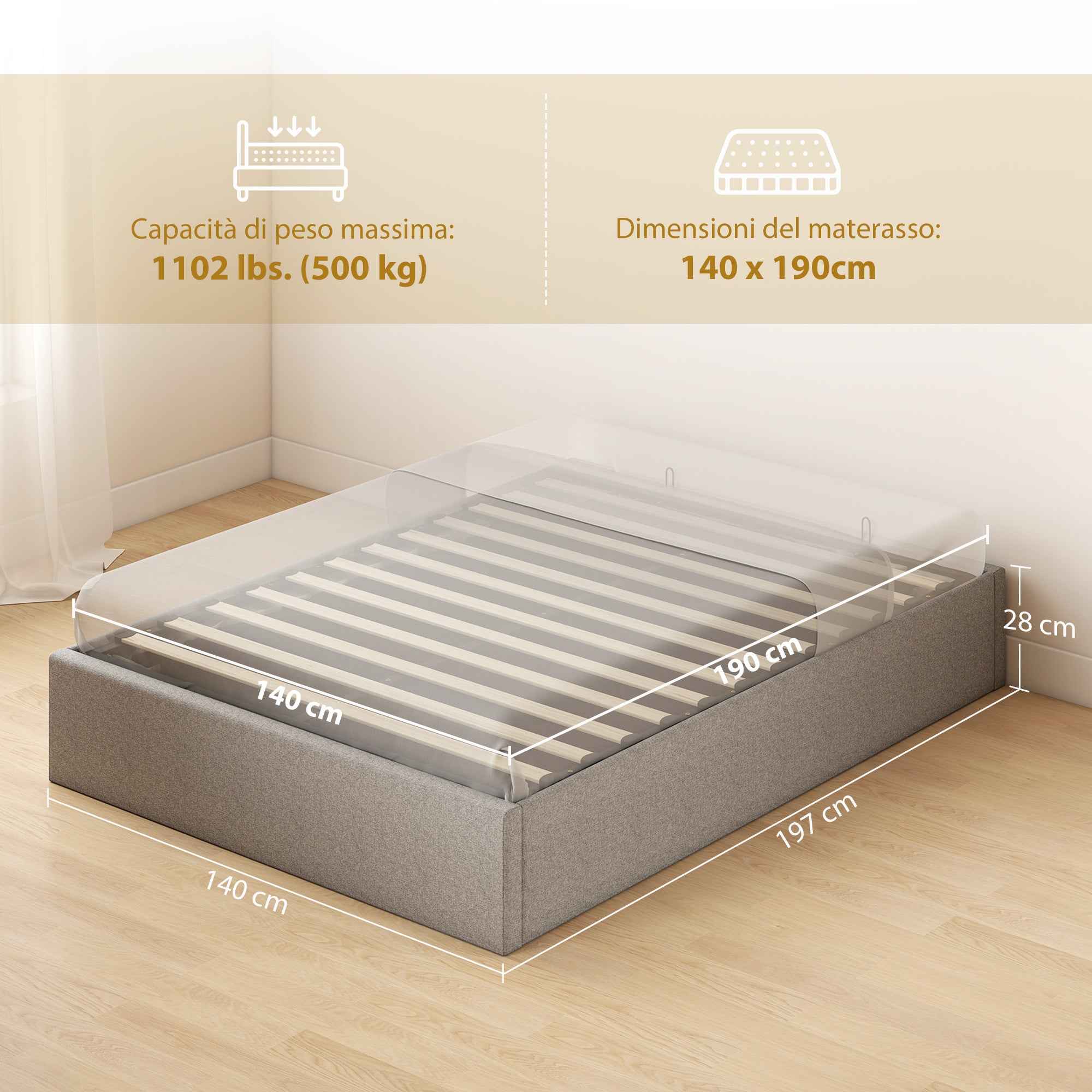 HOMCOM’s storage bed transforms your space with an easy-to-use lifting system, revealing a secure place to store bedding, pillows, or suitcases. Upholstered in linen-look fabric for warmth and style, it combines a sturdy eucalyptus and metal frame with poplar slats for stability. EVA feet protect your floor from scratches and prevent noise, making your bedroom cozy. Features: • The lift-up storage space offers ample space for bedding, pillows or suitcases • The linen-effect upholstery adds warmth, style and a modern, welcoming touch to the bedroom • Sturdy eucalyptus and metal storage bed frame with 12 poplar slats that securely supports the mattress, with a weight capacity of up to 500 kg • Non-slip EVA feet prevent noise and scratches on the floor every night • The anti-fall design keeps the mattress stable when lifting the bed to access the storage compartment • The slats support latex, memory foam or innerspring mattresses without the need for an additional base • Easy to assemble • Mattress not included Technical data: • Color: Grey • Material: Fabric (100% polyester), eucalyptus wood, poplar wood, metal • Overall dimensions: 197L x 140D x 28H cm • Suitable mattress size: 190L x 140D cm• Storage compartment dimensions: 187L x 136D x 20H cm• Maximum load: 500 kgPackage contents:• 1 x Double storage bed• 1 x Manual