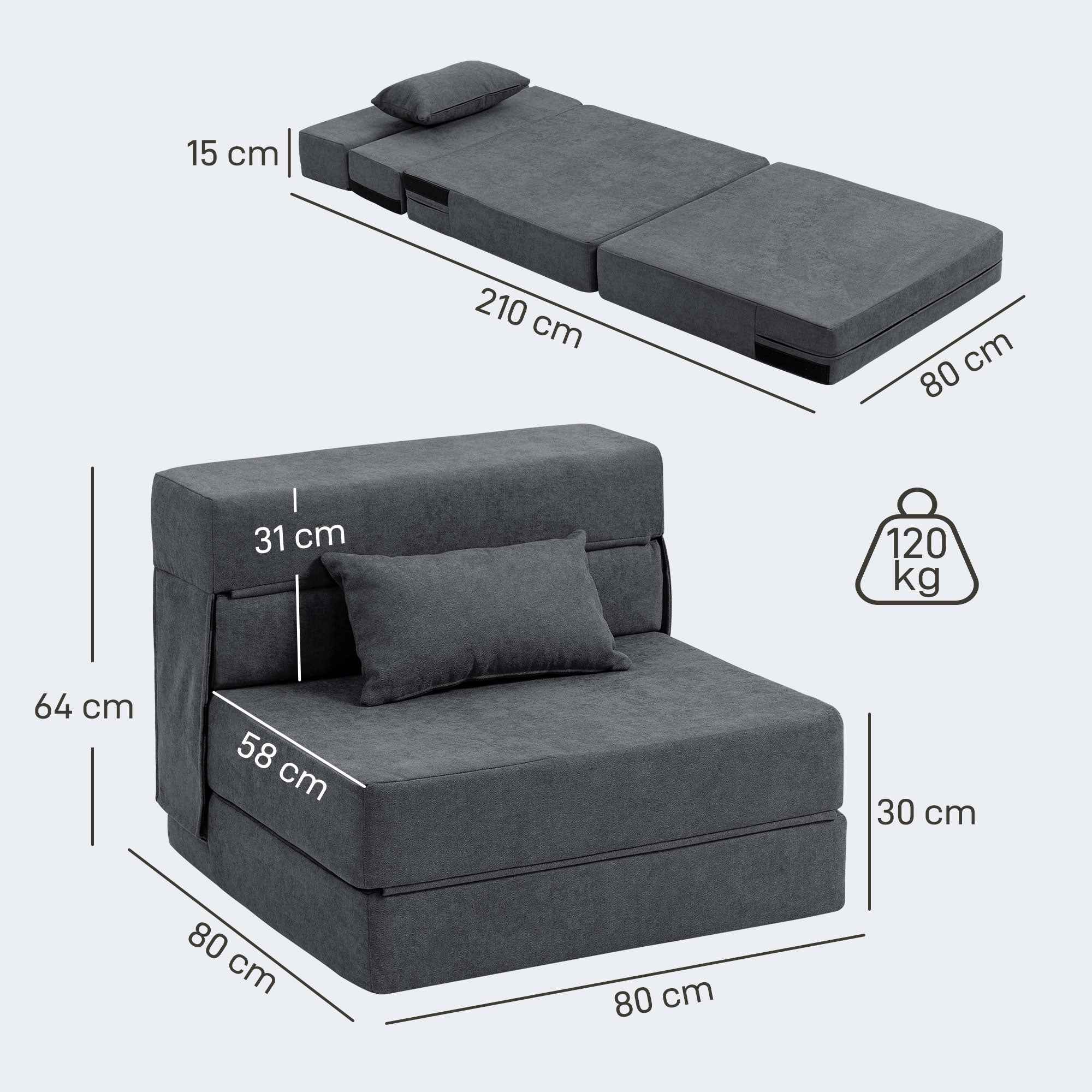 Looking for a sofa bed to relax in after work or to provide extra seating for guests? The HOMCOM sofa bed is a versatile solution that quickly transforms from a comfortable floor chair to a chaise lounge or a cozy mattress. Upholstered in soft ice velvet and padded with dense foam, it offers exceptional support. Suitable for small apartments, this space-saving armchair is a great choice for relaxing and unwinding. Features: • Easily converts from a folding armchair, chaise longue and bed • Lightweight, foldable frame makes it easy to transport and store • Chair bed upholstered in soft ice velvet for comfort and durability • High-density foam to improve seat support and resist deformation • Includes a pillow to improve lumbar support • Ideal for small spaces thanks to the space-saving design • No assembly required Technical data: • Color: Dark gray • Material: Ice velvet (100% polyester), foam • Bed dimensions: 210L x 80D x 15H cm • Chair dimensions: 80L x 80D x 64H cm • Seat dimensions: 80L x 58D cm • Seat height: 30 cm • Backrest dimensions: 80L x 31H cm • Depth: 30 cm (seat), 25 cm (backrest) • Capacity: 120 kg Weight: 120 kg Package contents: • 1 x Sofa bed • 1 x Cushion • 1 x Manual