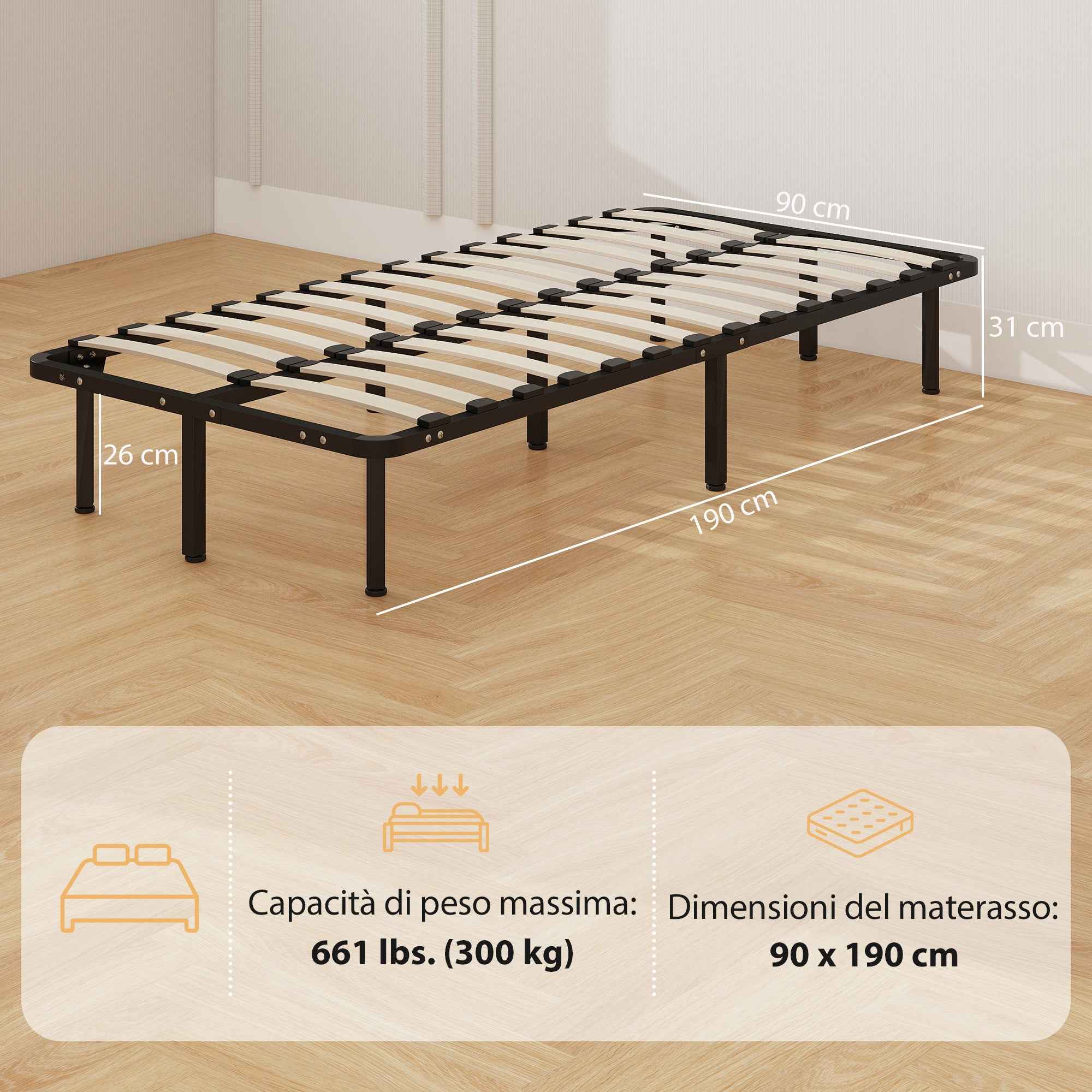 Our HOMCOM bed frame provides a sturdy solution for quality sleep. This bed supports up to 300 kg of weight, ensuring a safe rest, while the 26 cm of headroom under the bed provides plenty of storage space. Assemble the frame in just 30 minutes and create your ideal support for many nights of adequate sleep. Features: • 28-slat poplar wood bed frame with double-slat construction to offer solid and uniform support • Sturdy steel frame with a weight capacity of up to 300 kg • Bed frame with 9 legs with adjustable feet, which create stability on uneven floors, preventing any wobbling • There is 26 cm of free height space under the bed, so you can store various objects • Single bed with an industrial design with a combination of black steel and natural wood that suits the style of any room • Easy to assemble Technical data: • Color: Black, natural wood • Material: Steel, poplar wood • Overall dimensions: 90L x 190D x 31H cm • Suitable mattress size: 90L x 190D cm • Space under the bed: 26H cm • Weight capacity: 300 kg • Note: Please measure the internal dimensions of the bed frame first to ensure a perfect fit compatibility.Package contents:• 1 x Bed frame• 1 x Assembly manual