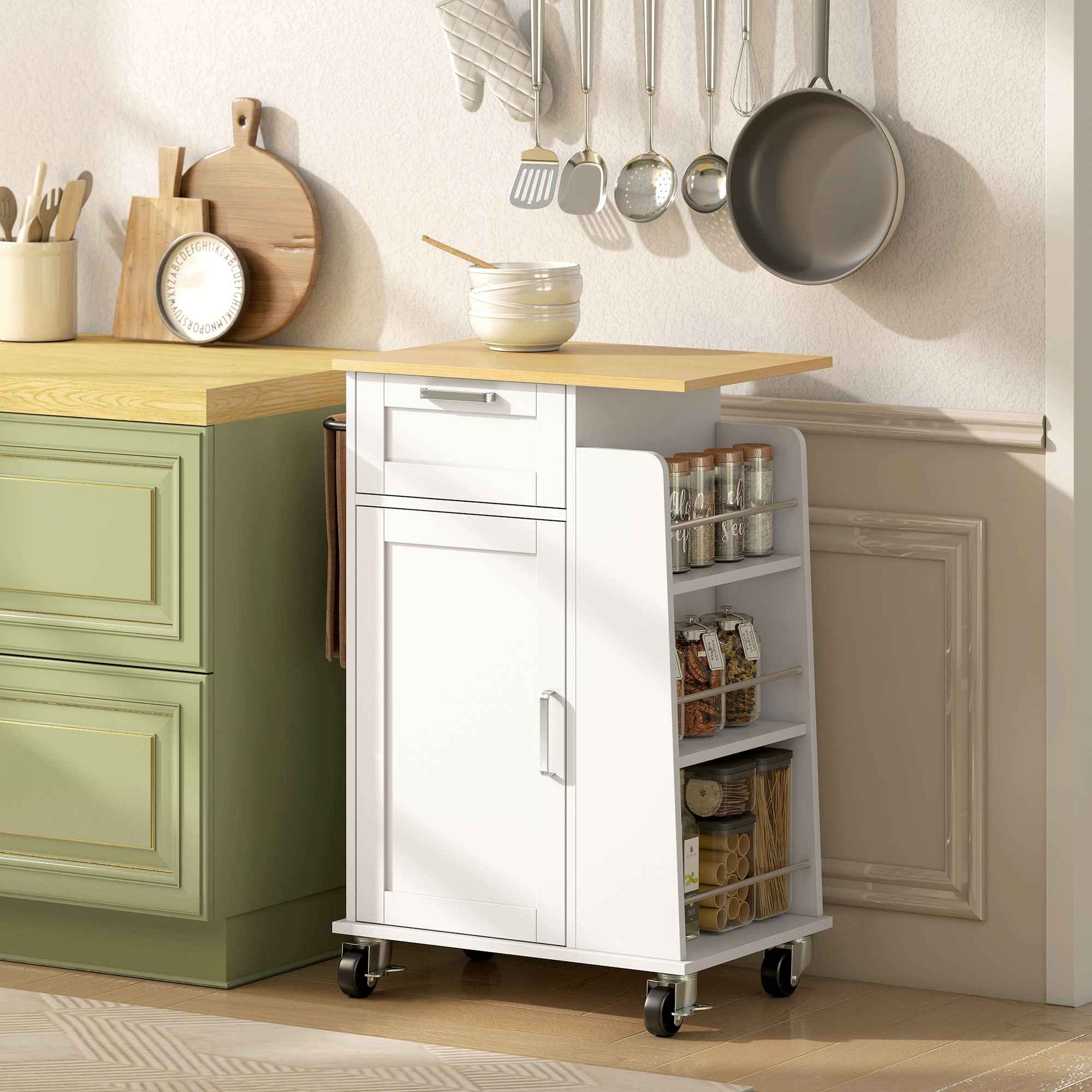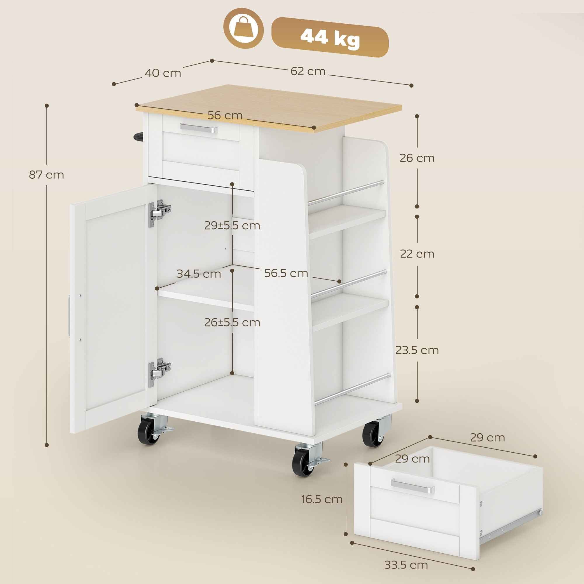 The HOMCOM kitchen cart restores calm and order to your home thanks to its space and ease of movement. Its well-organized compartments and soft-close doors ensure peace of mind throughout your home. Easily move the cart where you need it for food preparation or delivery and lock it securely once you reach your destination. Features:• Our food cart features a drawer, a 2-shelf cabinet, 3 spice racks and a towel holder, offering multiple storage options• The silent and smooth-closing door hinges offer added safety• The kitchen cart’s 4 360° swivel casters with 2 brakes offer both easy mobility and stability• The chipboard frame of the multipurpose cart can hold up to 44 kg of weight• Modern white finish with a natural wood-effect top that matches various furnishings• Assembly requiredTechnical data:• Color: White, natural wood• Material: Chipboard• Overall dimensions: 62W x 40D x 87H cm• Top dimensions: 56W x 40D cm• Internal dimensions of the drawer: 29W x 29D x 10H cm• Internal dimensions of the cabinet: 56.5L x 34.5D x 34H cm• Spice rack dimensions: 35L x 12.5D x 26/22/23.5H cm• Height from ground: 8.5 cm• Maximum load: 5 kg (drawer/shelf), 3 kg (spice rack), 25 kg (countertop), 44 kg (total)Package contents:• 1 x Kitchen trolley• 1 x Assembly manual