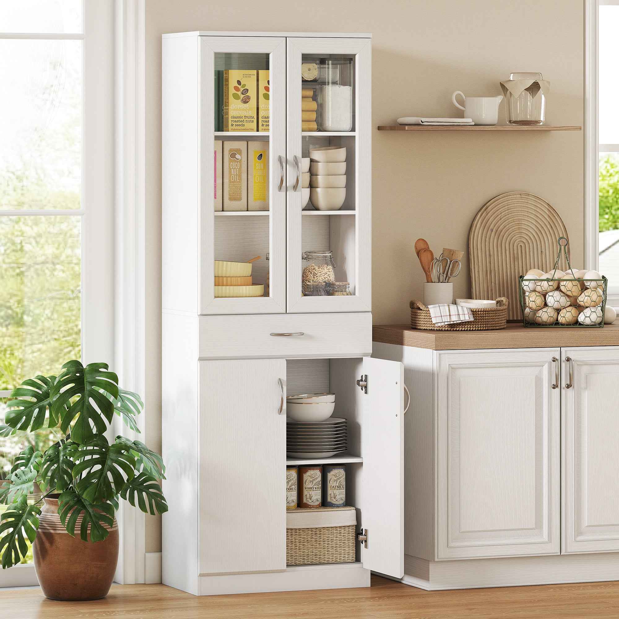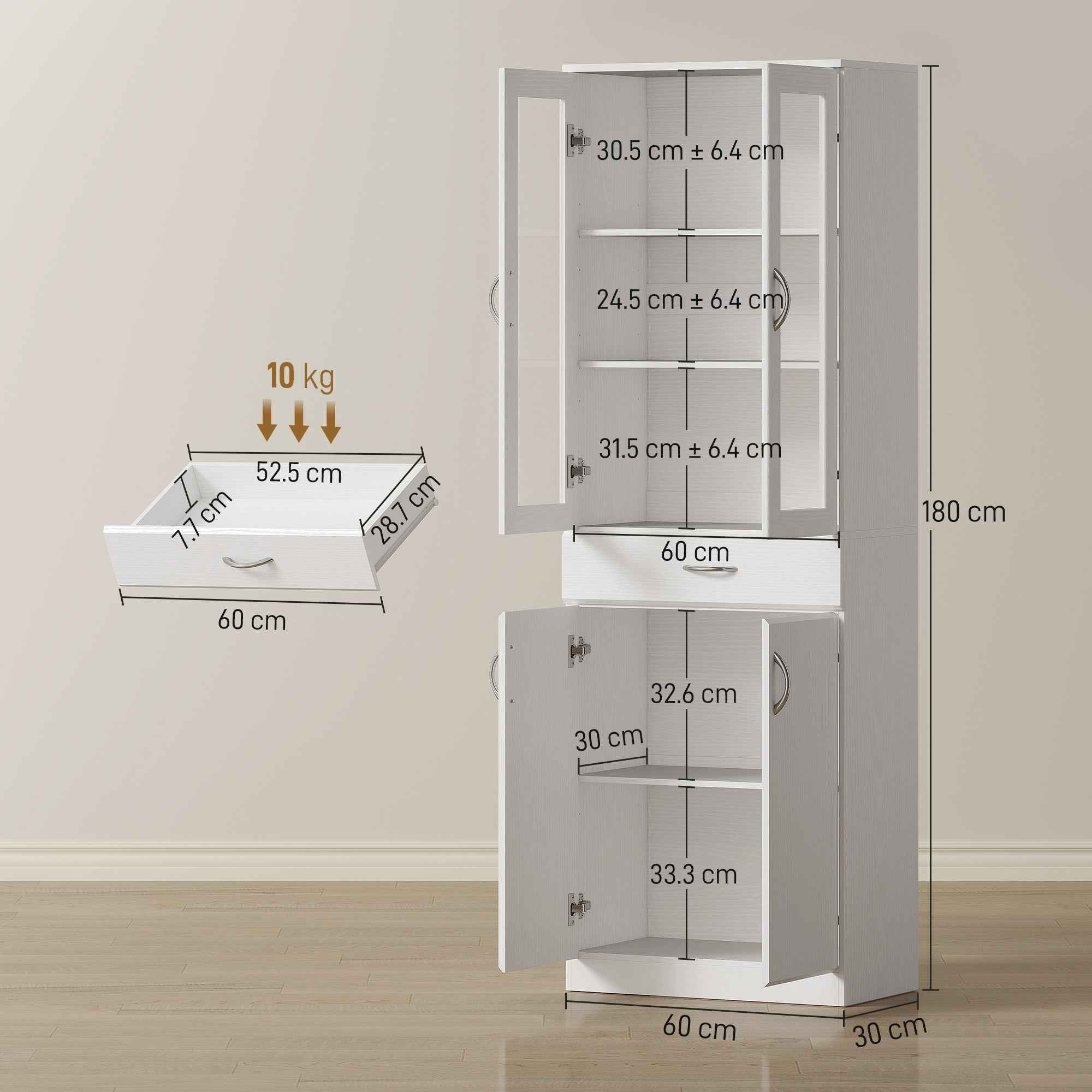 The HOMCOM modern sideboard is an essential piece of furniture for organizing your home. Featuring a three-zone design and adjustable shelves, this kitchen cabinet helps you organize dishes, pots, and pans of various sizes. The soft-close hinges offer silent and slow closing, while the anti-tilt device makes the kitchen cabinet stable and safe. Features: • Ample storage space with an upper cabinet with glass doors, a practical drawer and a lower cabinet • The upper cabinet features adjustable shelves on three levels to organize items of different sizes • The kitchen cabinet combines glass doors to display your items and closed doors to discreetly hide your items • Equipped with soft-close hinges, it ensures silent and slamming-free closing of the doors • Elegant white cabinet finish with silver handle and glass door • Multi-purpose furniture ideal for use as a kitchen pantry, buffet or bathroom cabinet • Includes an anti-tilt kit for added family safety • Assembly required Technical data: • Color: White • Material: Chipboard, tempered glass, MDF • Overall dimensions: 60W x 35D x 180H cm • Interior of upper cabinet: 57.2W x 30D x 88.8H cm• Lower cabinet interior: 57.2W x 30D x 67.2H cm• Upper shelf height: 30.5, 24.5, 31.5 cm (when on the 2nd, 5th level)• Shelf adjustment range: 6.4 cm• Lower shelf height: 32.6, 33.3 cm• Drawer interior size: 52.5W x 28.7D x 7.7H cm• Maximum load: 35 kg (total), 10 kg (drawer), 10 kg (bottom panel), 5 kg (shelves)Package contents:• 1 x Kitchen sideboard• 1 x Manual