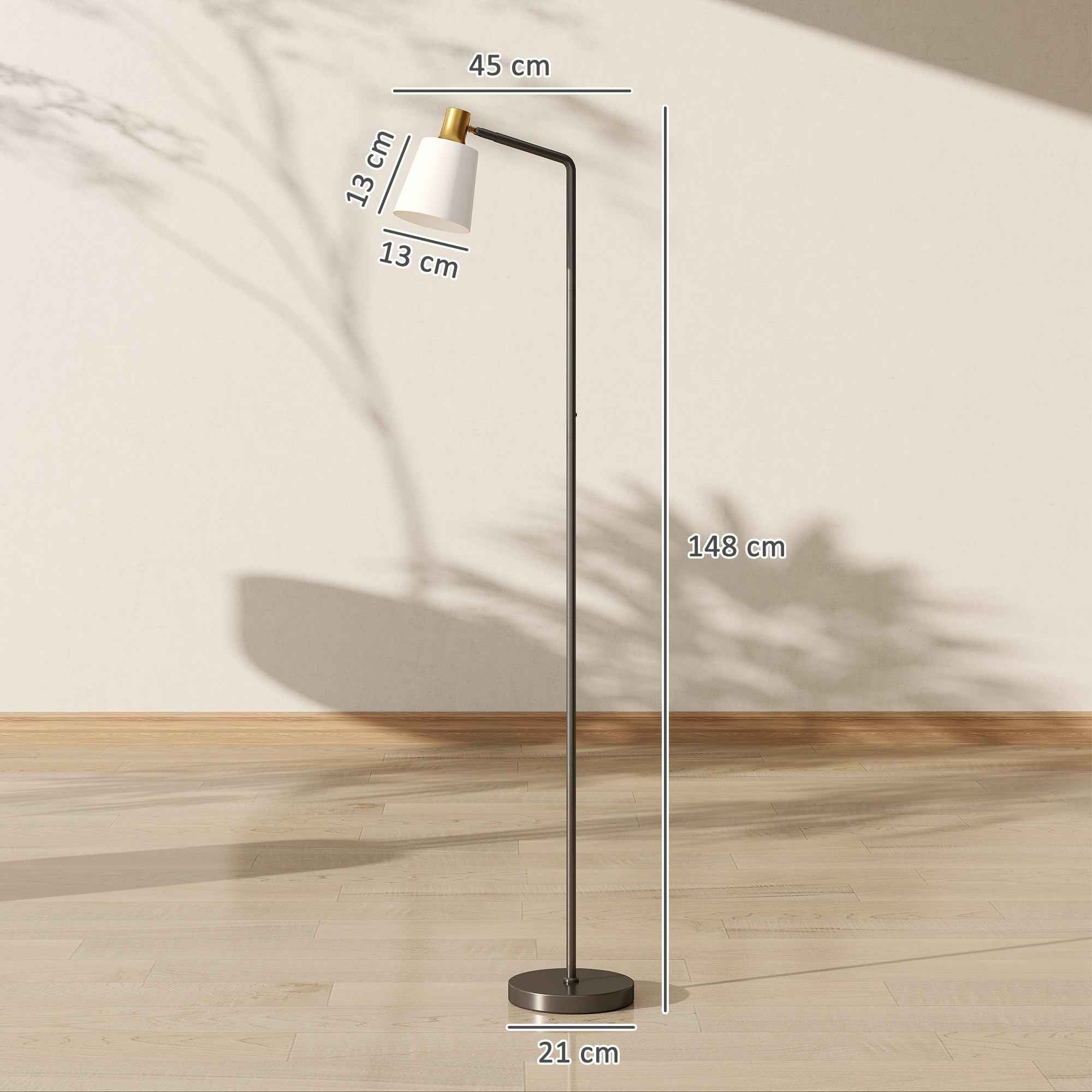 Looking for the perfect lighting to suit your lifestyle? Choose the HOMCOM LED floor lamp, which will transform your space. With its 3-level adjustable brightness, it creates the perfect atmosphere, and the 350-degree rotatable head illuminates precisely where needed. The modern lamp design adds a touch of style to any space, bringing elegance and creating a warm and inviting ambiance. Features:• Floor lamp with a 3-tone adjustable color temperature bulb, offering versatile lighting to suit any atmosphere• 350° rotatable lampshade directs light exactly where you need it• Modern, minimalist design adds a touch of style to any space• A heavy, weighted base prevents the floor lamp from tipping over, ensuring safety around children and pets• In-line switch allows for easy control without having to bend over• Assembles in just 15 minutes without any tools Technical data:• Color: Black, white, gold tone• Material: Steel, plastic• Overall dimensions: 45W x 21D x 148H cm• Lampshade dimensions: Ø13 x 13H cm• Base dimensions: Ø21 x 3H cm• Power cord length: 180 cm• Power: 9W (E27-A60), Max 25W (E27 socket)• Luminous flux: 800 lm• Color temperature: 3000K/4000K/6500K• Energy class: F• Voltage: AC 220-240V 50HzPackage contents:• 1 x Floor lamp• 1 x Manual