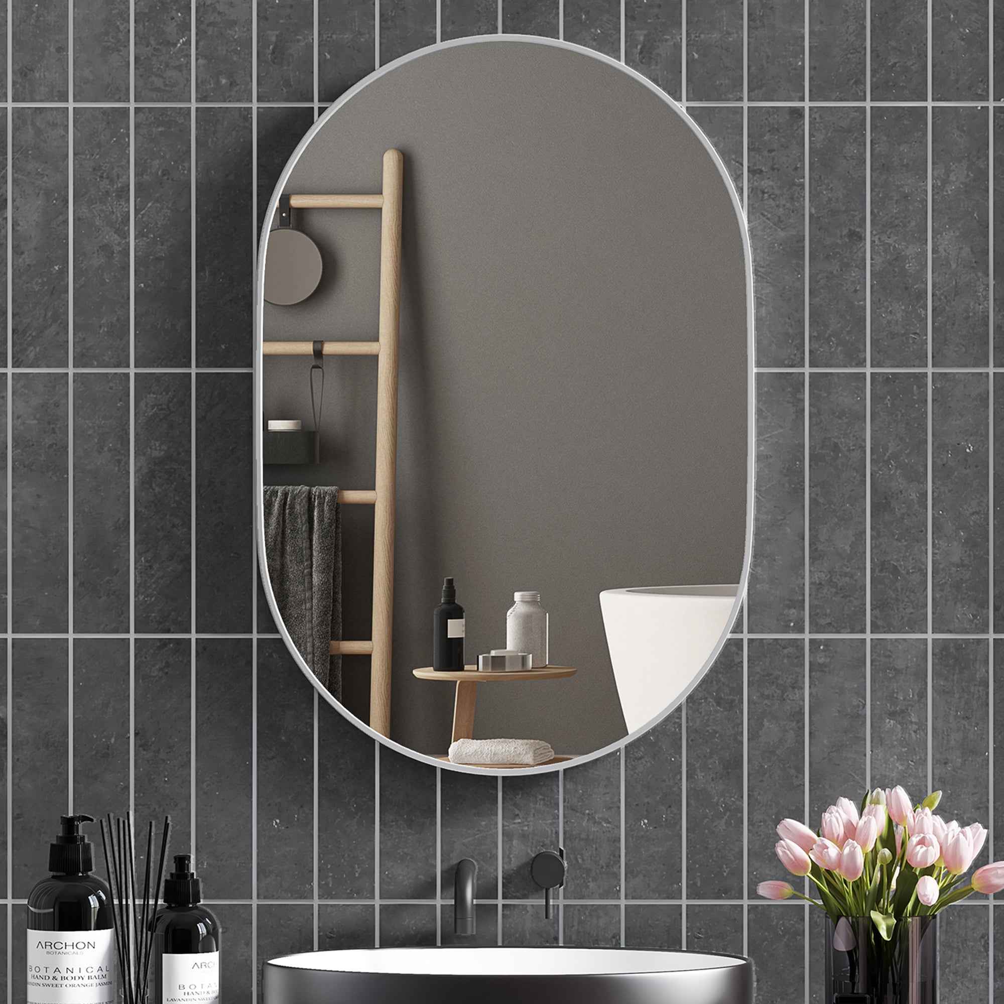 Add a touch of elegance to your bathroom with the HOMCOM oval wall mirror. Featuring an aluminum alloy frame, this bathroom mirror combines style and long-lasting reliability. The anti-explosion film on the back ensures maximum peace of mind during use and transport, and you can hang the entrance mirror easily, vertically or horizontally, thanks to the 3 rear hooks. Features: • Modern, oval design that makes it ideal for use not only in the bathroom but also as a mirror for the living room, entrance hall, bedroom • Aluminum alloy frame that ensures strength and long life over time • Anti-explosion film on the back for safe use of the bathroom mirror • Corrosion resistant and ideal for humid environments, such as the bathroom • Rear hook for hanging the mirror on the wall • Oval mirror surface with a sharp and clear reflection • No assembly required, just fixing to the wall Technical data: • Color: Silver • Material: Aluminum alloy, glass • Overall dimensions: 60L x 3D x 90H cm • Mirror dimensions: 58L x 88D cm • Mirror thickness: 3 mm Package contents: • 1 x Oval bathroom mirror • 1 x Manual