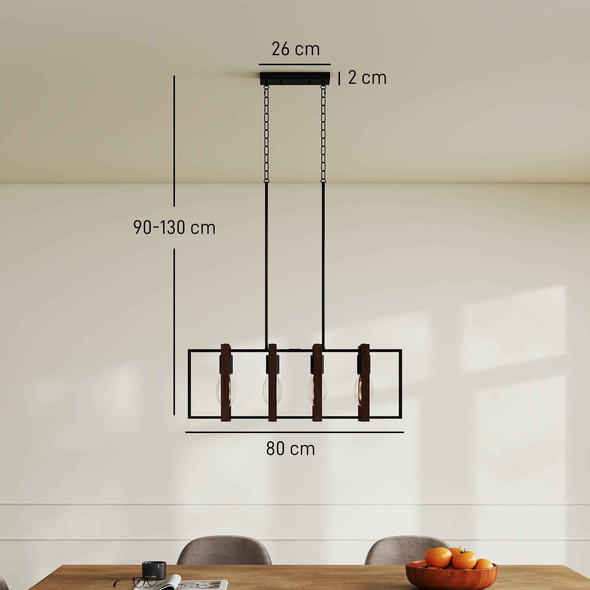 Is the light in your home too bright or too dim? Our rustic-style HOMCOM pendant light will transform your home. Adjust the rotating wooden frames and adjust the brightness to suit any occasion. This structure is able to offer you a more intense light for preparing meals, but also a soft brightness for group dinners, always guaranteeing the ideal atmosphere. Features: • The adjustable chain and rotating frames of the pendant chandelier allow you to create unique light plays • The 4 E27 sockets of the living room chandelier offer a variety of bulb choices for your lighting • Thick steel and solid wood guarantee long-lasting resistance • The elegant design of the pendant lamp enhances any kitchen, dining room or entrance • Quick assembly in 15 minutes with pre-assembled parts Technical data: • Color: Black, walnut brown • Material: Steel, wood • Overall dimensions: 80W x 21D x 90-130H cm • Ceiling plate dimensions: 26W x 9D x 2H cm • Chain length: 50 cm • Adjustable hanging length: 90-130 cm • Maximum load: 5 kg • Lamp holder: 4 x E27 (bulbs not included), max 40W for lamp holder, maximum bulb size G80• Voltage: 220-240V~50HzPackage contents:• 1 x Pendant light• 1 x Assembly manual