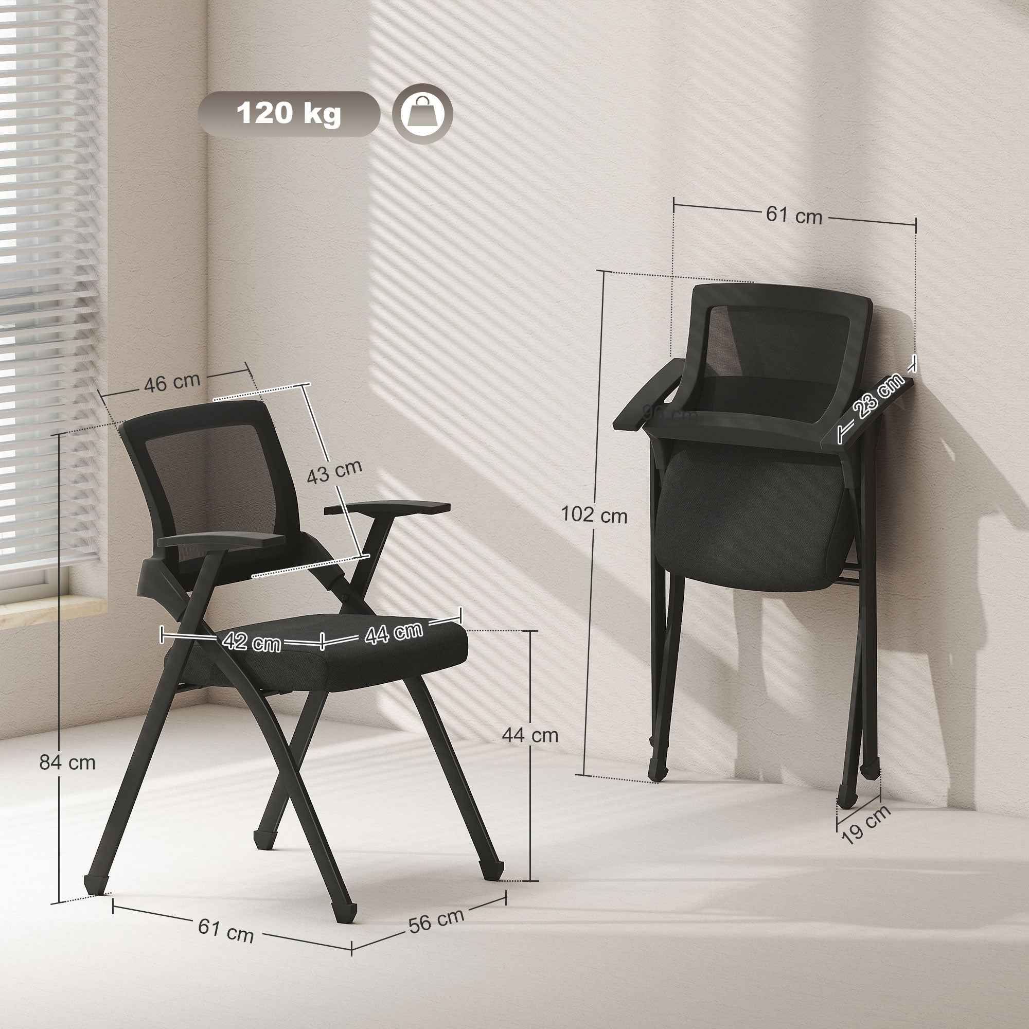 Enjoy a relaxing and safe seat at home on our folding chairs from HOMCOM, a perfect combination of comfort and practicality! The 5.5 cm padded seat, upholstered in an elegant linen-effect fabric, and the ergonomic mesh backrest ensure maximum comfort. Easily fold them to save space and use them anywhere in the home, from the living room to the kitchen. These seats hold up to 120 kg of weight and protect your floors thanks to the non-slip feet. Features: • Folding chairs with padded seats in breathable linen-effect fabric to ensure long-lasting comfort • The curved mesh backrest and armrests of the padded chairs enhance the seating experience • The structure folds easily to save precious space at home • Sturdy steel frame that supports up to 120 kg safely • Modern chairs with a triangular structure and non-slip feet that ensure stability • Set of 2 suitable for different environments • No assembly required Technical data: • Color: Black • Material: Linen-effect fabric (100% polyester), foam, steel • Overall dimensions: 61L x 56D x 84H cm • Folded dimensions: 102L x 61W x 19H cm • Seat dimensions: 44L x 42D x 44H cm • Seat thickness: 5.5 cm • Backrest dimensions: 46L x 43H cm• Armrest dimensions: 23L x 6L cm• Armrest height from seat: 21 cm• Weight capacity: 120 kgPackage contents:• 2 x Folding chairs• 1 x Assembly manual