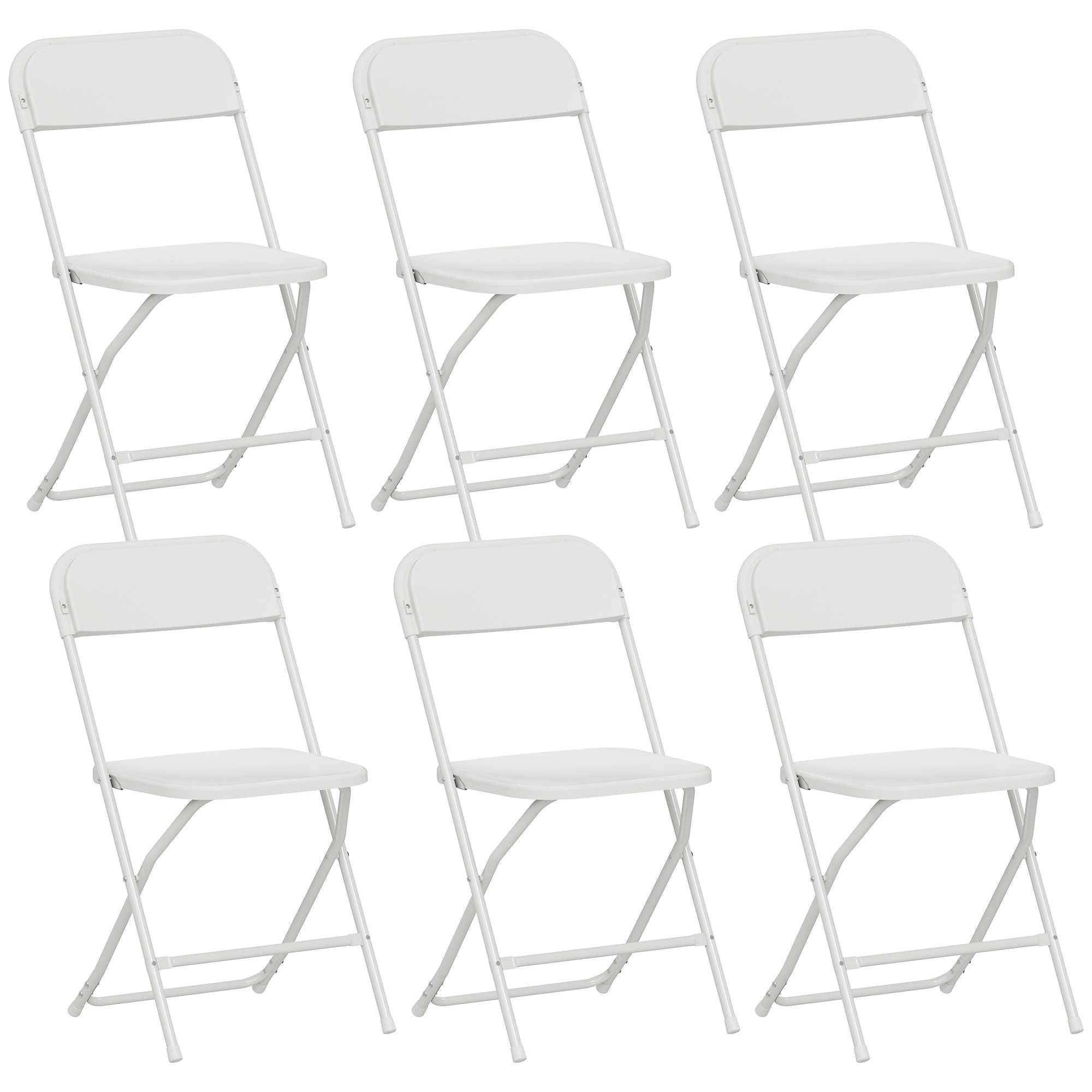 The comfortable, compact, and functional design of this set of 6 folding chairs from HOMCOM is ideal for any home. The powder-coated steel frame offers maximum strength and support, while the curved PP seat and backrest provide optimal comfort, with integrated drainage holes. These chairs are perfect for decorating the dining room, living room, study, reception area, etc. Features: • Set of 6 folding chairs to accommodate many guests • Plastic chairs with curved backrest and spacious seat to ensure optimal comfort • Drainage holes that allow liquids to drain easily • Durable, lightweight and easy to clean PP plastic panel • Modern chairs with triangular powder-coated steel frame for strength • Non-slip feet for balance and safety • Foldable and compact design for storage in small spaces • No assembly required Technical data: • Color: White • Material: PP, steel • Overall dimensions: 45L x 49D x 79.5H cm • Folded dimensions: 96L x 45L x 5.5H cm • Seat dimensions: 40L x 39.5D cm • Seat height: 45 cm • Backrest dimensions: 45L x 39.5H cm • Footrest height from the ground: 15.5 cm • Dimensions of the Steel tube: Ø190 x 1 mm• Weight capacity: 120 kgPackage contents:• 6 x Folding chairs• 1 x Instruction manual