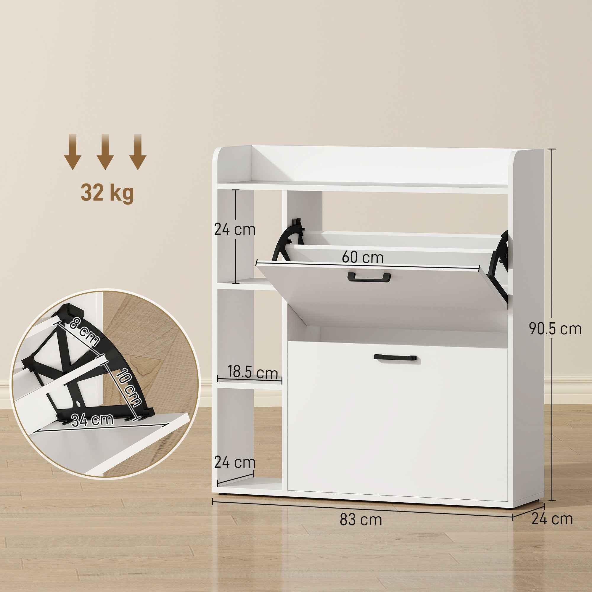 Is your entryway full of shoes in disarray? The HOMCOM slim shoe rack will restore order, thanks to its compact design, perfect for limited spaces. It features two drop-down drawers with adjustable shelves for boots and sneakers, and side shelves for children’s shoes and all the essential accessories. A modern shoe rack with a versatile design that adapts to any style of home. Features:• Entryway shoe rack that combines drawers, open compartments and a top for all your daily essentials• Adjustable shelves inside the drawers to accommodate various types and sizes of shoes• Holds up to 15 pairs of shoes, suitable up to size 46.5 EU• This slim shoe rack has a thin 24 cm profile, ideal for narrow entryways and hallways• Includes anti-tip kit and non-slip feet, for stability and safety• Assembly required Technical data:• Color: White• Material: Chipboard• Overall dimensions: 83W x 24D x 90.5H cm• Top space: 80W x 22D x 8H cm• Hinged door dimensions: 60W x 38.5H cm• Central shelf: 8D x 19H cm (inner layer), 10D x 34H cm (outer layer)• Compartment: 18.5L x 24D x 24H cm• Maximum shoe size: EU 46.5• Maximum shoe capacity: 15 pairs• Maximum load: 3 kg (per tipping layer), 5 kg (per compartment), 5 kg (top), 32 kg (overall)Package contents:• 1 x Slim shoe rack• 1 x Manual