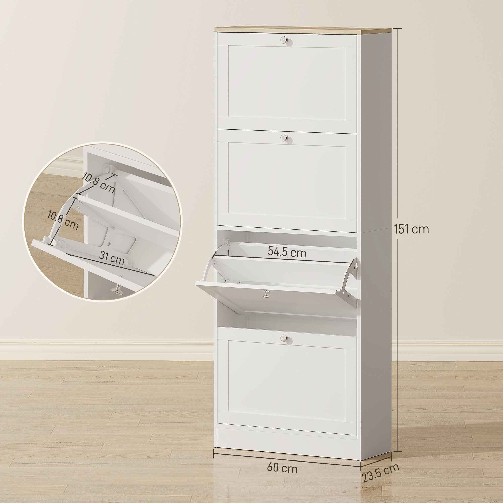 If your home needs a versatile piece of furniture that can conveniently store your shoes, this space-saving shoe rack from HOMCOM will meet all your needs. The structure is custom-designed for any room in the house and includes 4 drop-down doors with adjustable shelves to accommodate various types of shoes. The presence of a support surface allows you to place ornaments and other objects, while the anti-tip design ensures the right safety. Features: • The 4 tilting drawers of the entrance shoe rack can hold up to 18-24 pairs of shoes (maximum size: EU 44.5) • Adjustable shelves on two levels to adapt to various shoe sizes • The support surface of the modern shoe rack offers additional space for placing some ornaments • The modern style of the slim shoe rack matches any decor • Compact design, ideal for small spaces • The anti-tip mechanism improves safety • Shoe rack made of melamine-coated chipboard for easy cleaning • Assembly required Technical data: • Color: White • Material: Chipboard • Overall dimensions: 60L x 23.5D x 151H cm • Door dimensions: 56.5L x 34.5H cm • Internal drawer dimensions: 54.5L x 31D x 24H cm Capacity: 18-24 pairs of shoes• Maximum shoe size: EU 44.5• Weight capacity: 50 kg (total), 10 kg (drawer/top)Package contents:• 1 x Space-saving shoe rack• 1 x Assembly manual