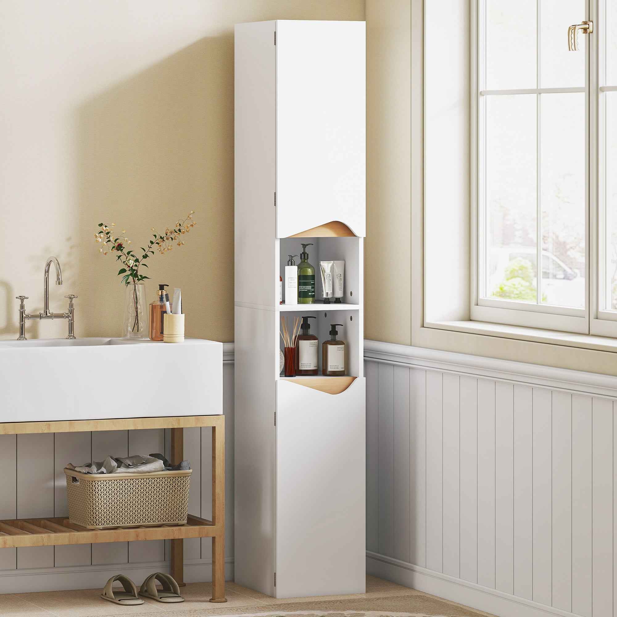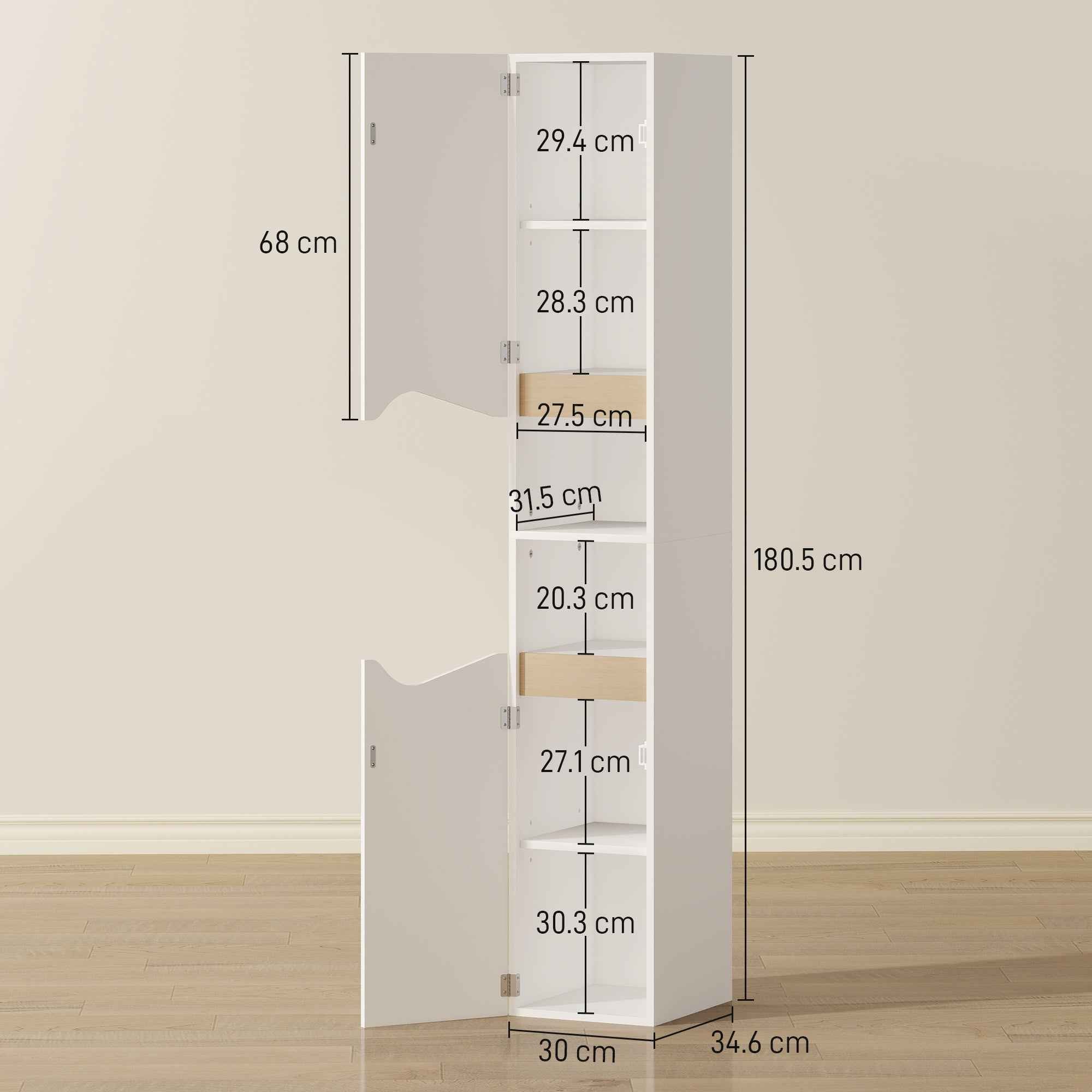 Our HOMCOM bathroom cabinet eliminates bathroom clutter without taking up excess space. The structure features multiple compartments and adjustable shelves for storing items of various sizes. Its white and wood tones transform your space into a corner of serenity, improving your daily routine. Features: • The 2 closed cabinets and 2 open shelves of the bathroom column keep the space organized • The tall and slim design maximizes storage space to save space • The 2 adjustable shelves on 3 levels inside the bathroom column cabinet adapt to accommodate objects of various heights • The 2 colors and curved cutouts elegantly match any decor • The package includes an anti-tip kit to fix it to the wall, ensuring safety in the room • Bathroom cabinet made of chipboard with non-slip feet for reliable daily use with an easy-to-clean melamine surface • Assembly required Technical data: • Color: White, natural wood • Material: Chipboard • Overall dimensions: 30W x 34.6D x 180.5H cm • Internal cabinet dimensions: 27.5W x 31.5D x 59H cm • Cabinet shelf heights: 29.4H cm, 28.3H cm (top), 27.1H cm, 30.3H cm (bottom)• Open shelf dimensions: 27.5W x 31.5/30D x 20.3H cm• Height from ground: 0.4 cm• Maximum load: 30 kg (total), 5 kg (each shelf)Package contents:• 1 x Bathroom column cabinet• 1 x Assembly manual