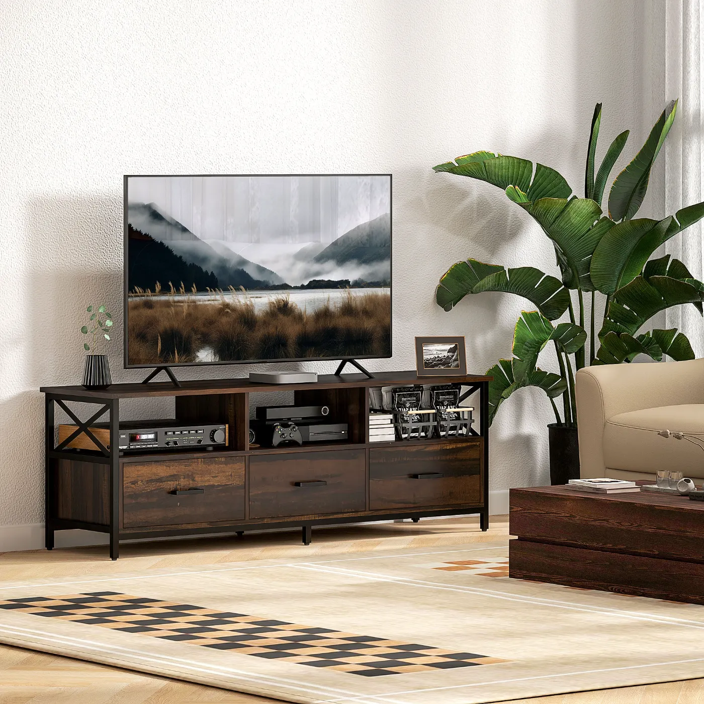 - • The industrial design of the TV cabinet features rustic brown panels, black frame and X-shaped sides