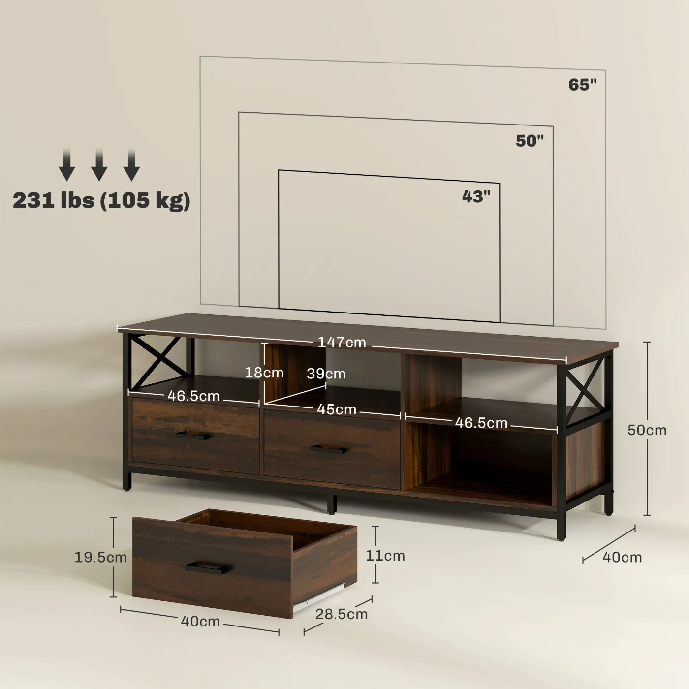 - DIMENSIONS: Overall dimensions: 147W x 40D x 50H cm. Internal drawer dimensions: 40W x 28.5D x 11H cm. Assembly required