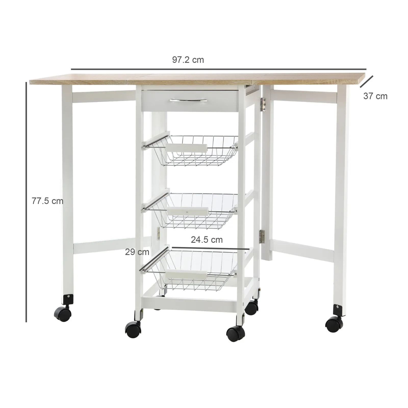 • DIMENSIONS: Dimensions with flaps closed: 37W x 37D x 77.5Hcm. Dimensions with flaps open: 97.2W x 37D x 77.5Hcm. Metal baskets: 24.5W x 29D x 7Hcm. Maximum weight capacity: 50kg. Assembly required