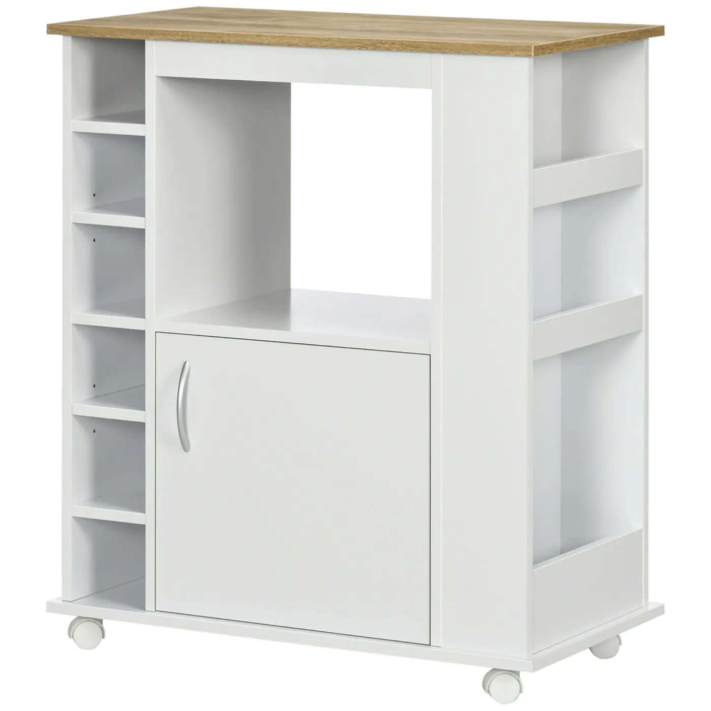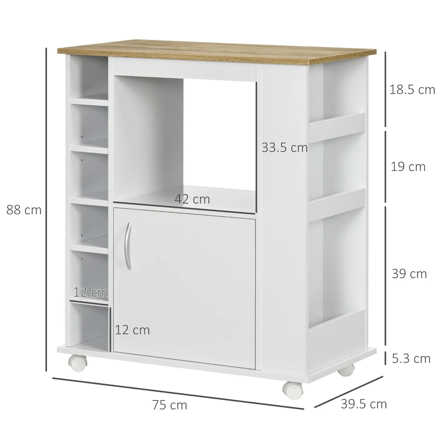 - SPACE FOR EVERYTHING: This practical kitchen trolley is ideal for optimising space in your home. It is perfect for storing plates, boxes and baskets in the cabinets, spices in the side compartments and dishes in the central compartment