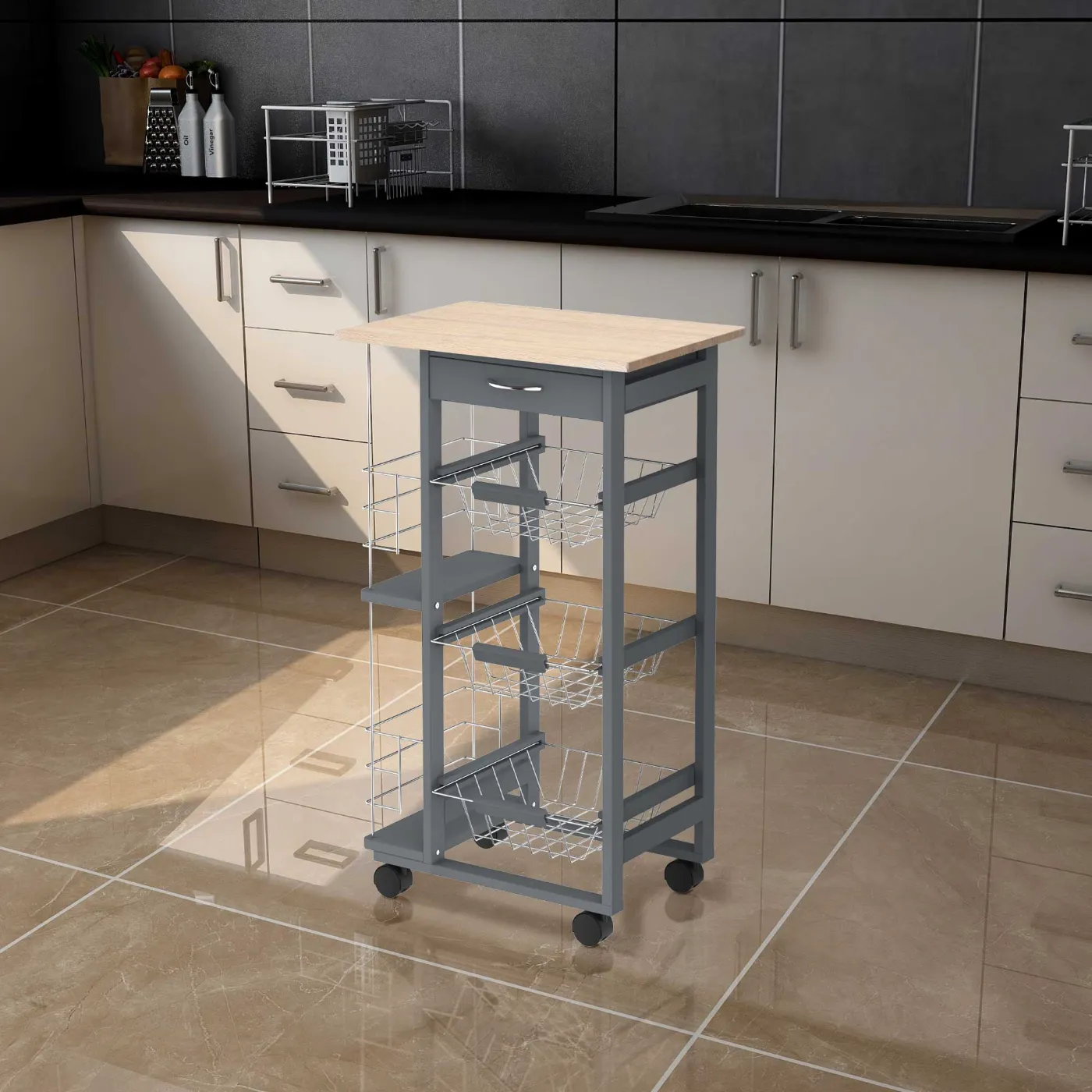 - MULTIPURPOSE: With this kitchen trolley, you have a work surface for kneading or cooking, a drawer, three removable metal baskets and two side bottle holders
