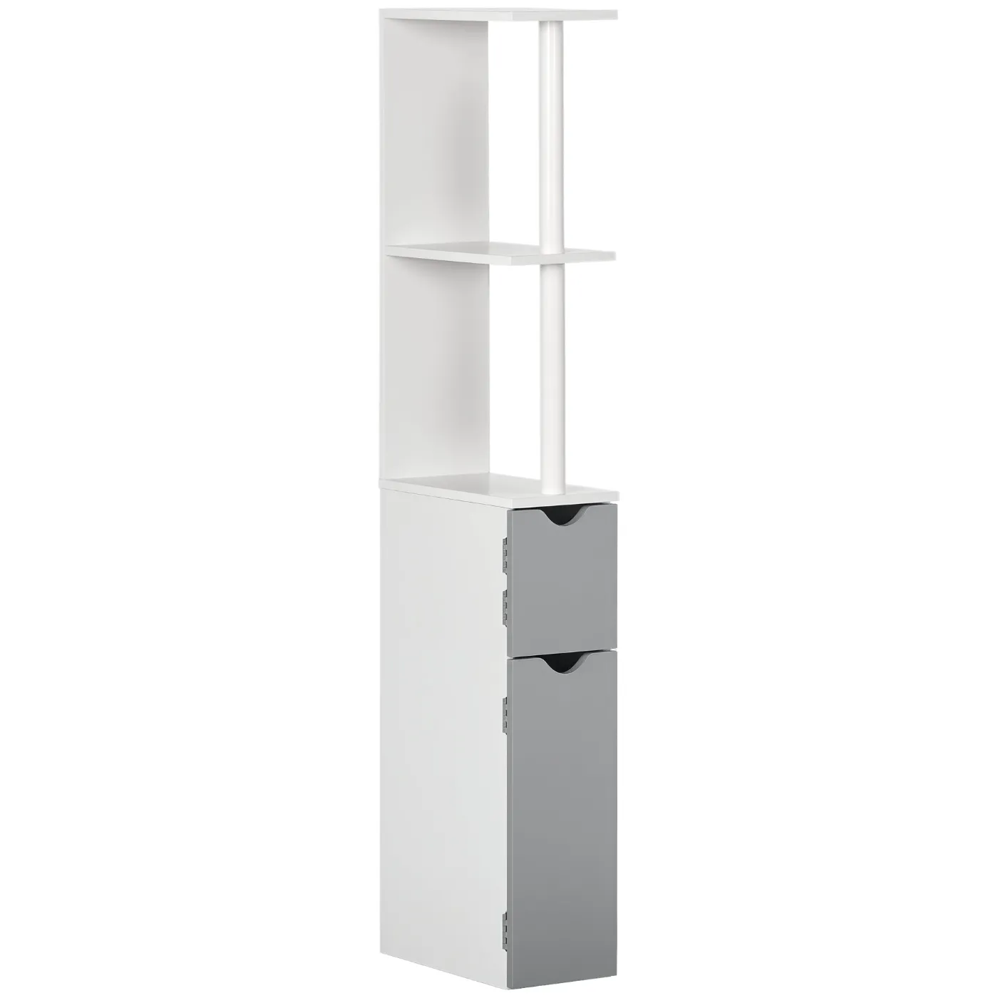 Technical data:• Color: White and gray• Material: MDF, chipboard• Overall dimensions: 15.2L x 29.8D x 118H cm• Open shelf dimensions: 28L x 15D x 28.5H cm• Internal cabinet dimensions: 12.3L x 26.5D x 16.8H cm (upper), 12.3L x 26.5D x 37H cm (lower)• Weight capacity: 12 kg (total), 3 kg (shelves)