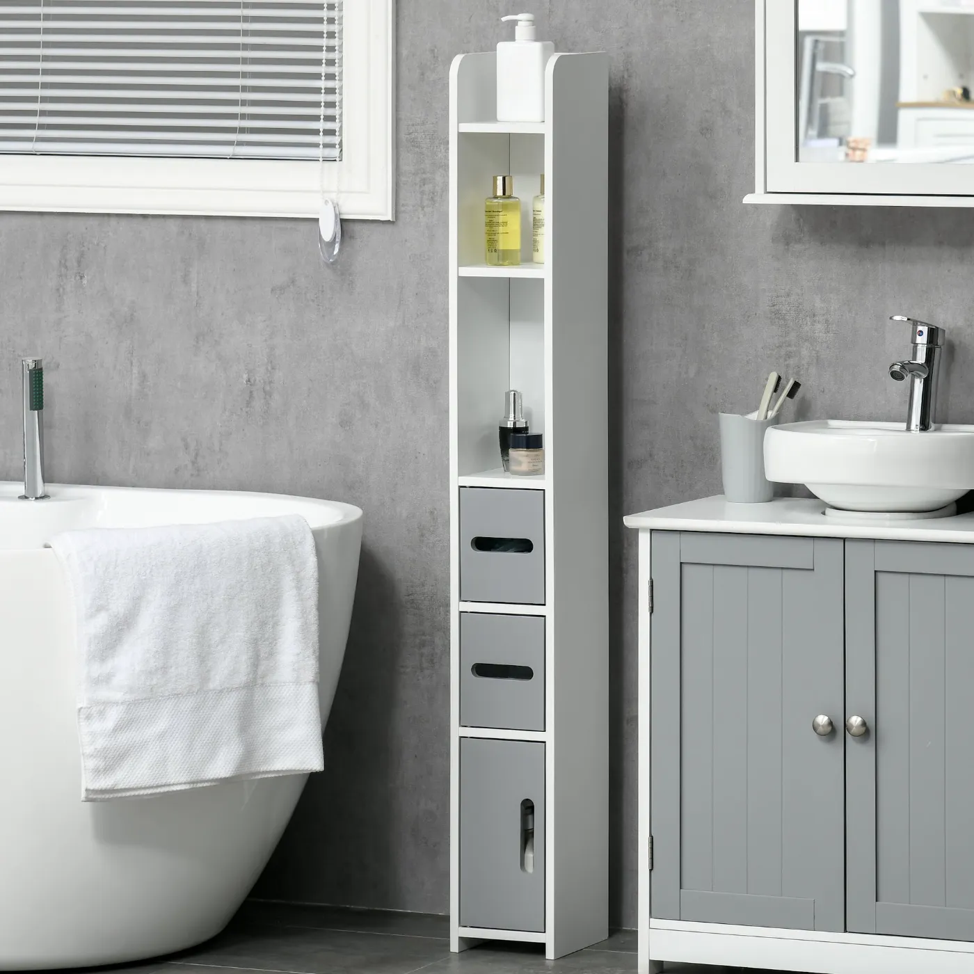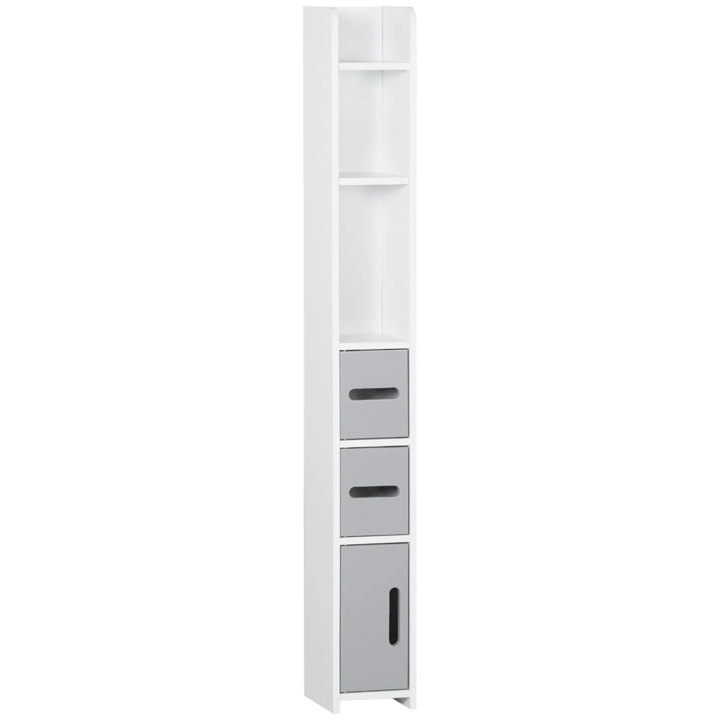 Maximize space in your rooms and keep everything organized with the kleankin bathroom column. The narrow, tall design allows you to maximize vertical space while minimizing floor space. Featuring three open compartments and three small cabinets, this multipurpose unit offers plenty of practical storage space for all your products. The melamine-coated wooden structure makes the bathroom cabinet water-resistant and easy to clean.Features:• Tall and compact design perfect for small spaces• Modern style ideal for bathroom, living room or entryway• Sturdy MDF and particle board structure• 3 open compartments and 3 cabinets• Easy-to-clean and water-resistant melamine coating• Anti-tip device• Assembly requiredTechnical data:• Color: Grey, White• Material: MDF, Particle board• Overall dimensions: 15W x 17D x 120Hcm• Open compartment dimensions: 16.8W x 12.6D x 9Hcm (top), 16.8W x 12.6D x 18Hcm (middle), 16.8W x 12.6D x 27Hcm (bottom)• Internal cabinet dimensions: 12W x 15D x 15Hcm (two upper cabinets), 12W x 15D x 25Hcm (bottom)• Base clearance: 2cm• Weight capacity: 15kg (total), 3kg (shelves)Package contents:• 1 x Bathroom column• 1 x Manual