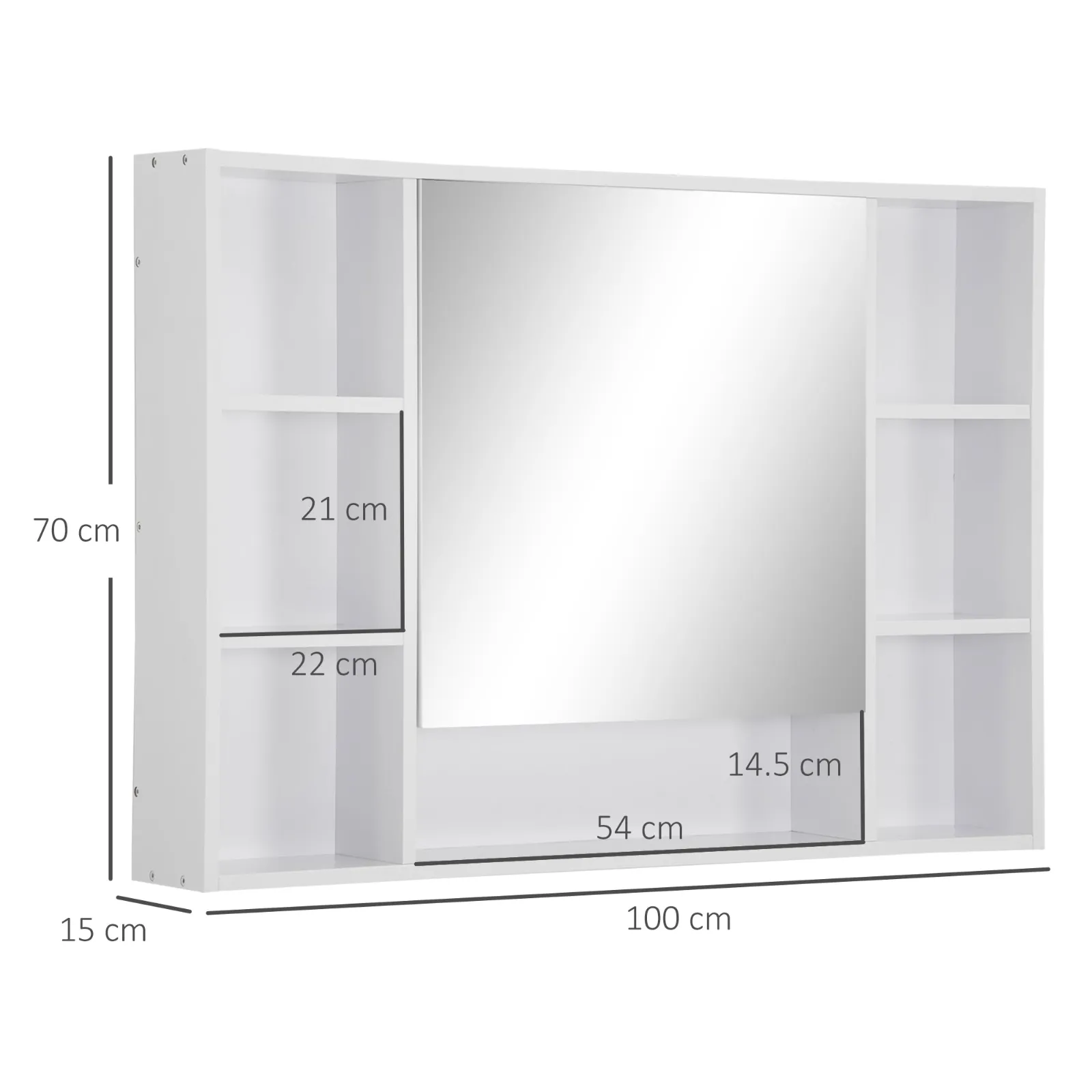 Add space to your bathroom to keep the toilet products in order with the Kleankin mirror furniture. The minimalist lines make it perfect to combine with different styles of furniture and offers you all the space you need to have everything in order. The melamine coating facilitates cleaning and maintenance of the bathroom mirror. An inevitable furniture for your home! Features: • Wall design to take advantage of the space vertically • Mirror for optimal visibility • Many shelves to keep your products in order • Shocking hinge for a silent closure • Made in MDF with melamine coating Easy to clean • Assembly required technical assembly: • Color: white • Material: mdf, glass • General dimensions: 100l x 15p x 70acm • Mirror size: 54L x 51acm • Internal size cabinet: 54L x 12p x 47acm • Side shelves size: 22L x 13.5p x 21cm • lower shelf dimensions: 54L x 13.5p x 14.5acm • Weight capacity: 15kg (total), 5kg (shelf) Content of the package: • 1 x Bathroom mirror mobile • 1 x Manual