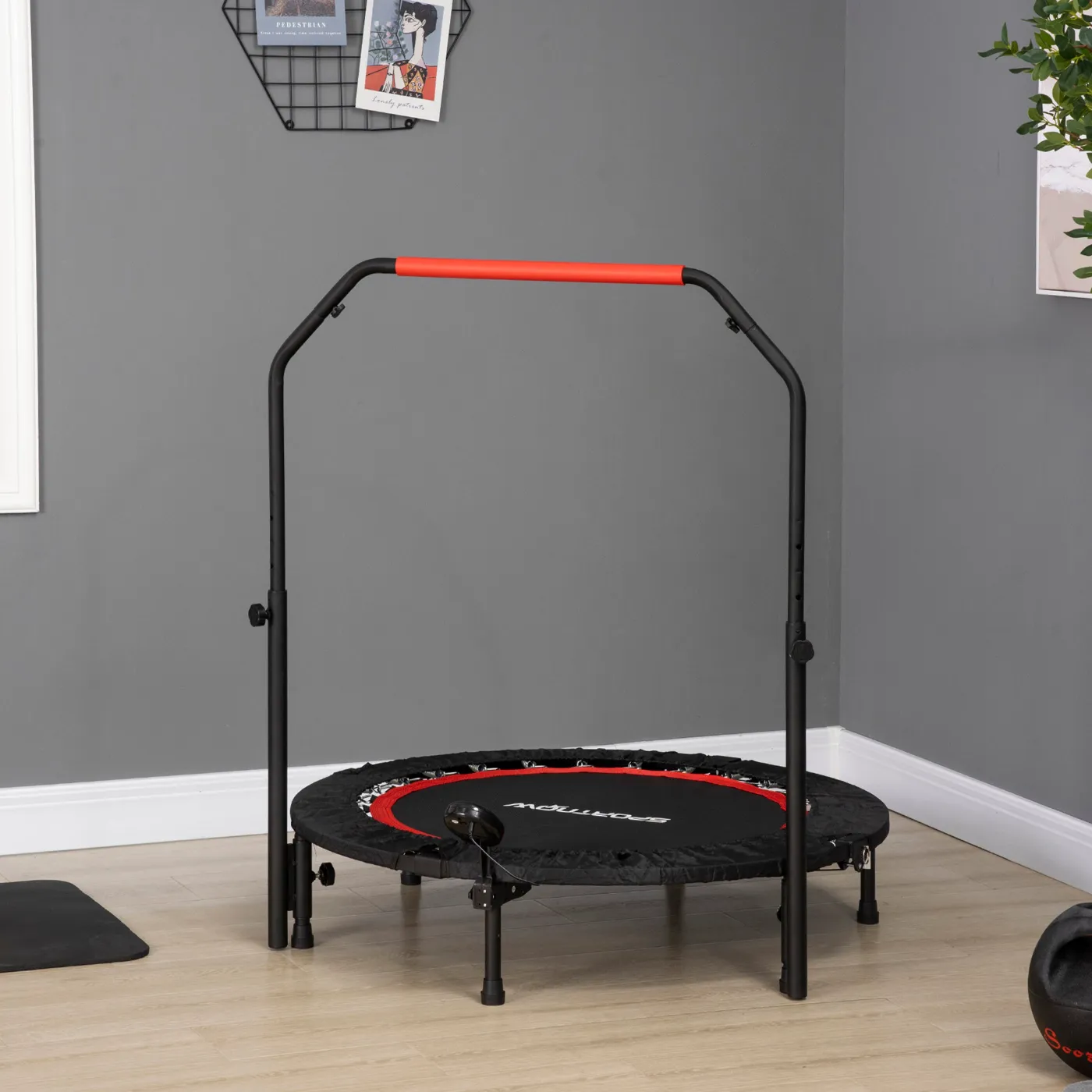 - ADJUSTABLE HANDLE: The handle of this fitness trampoline can be adjusted to 4 levels from 99 to 123 cm, making it perfectly adaptable to your needs