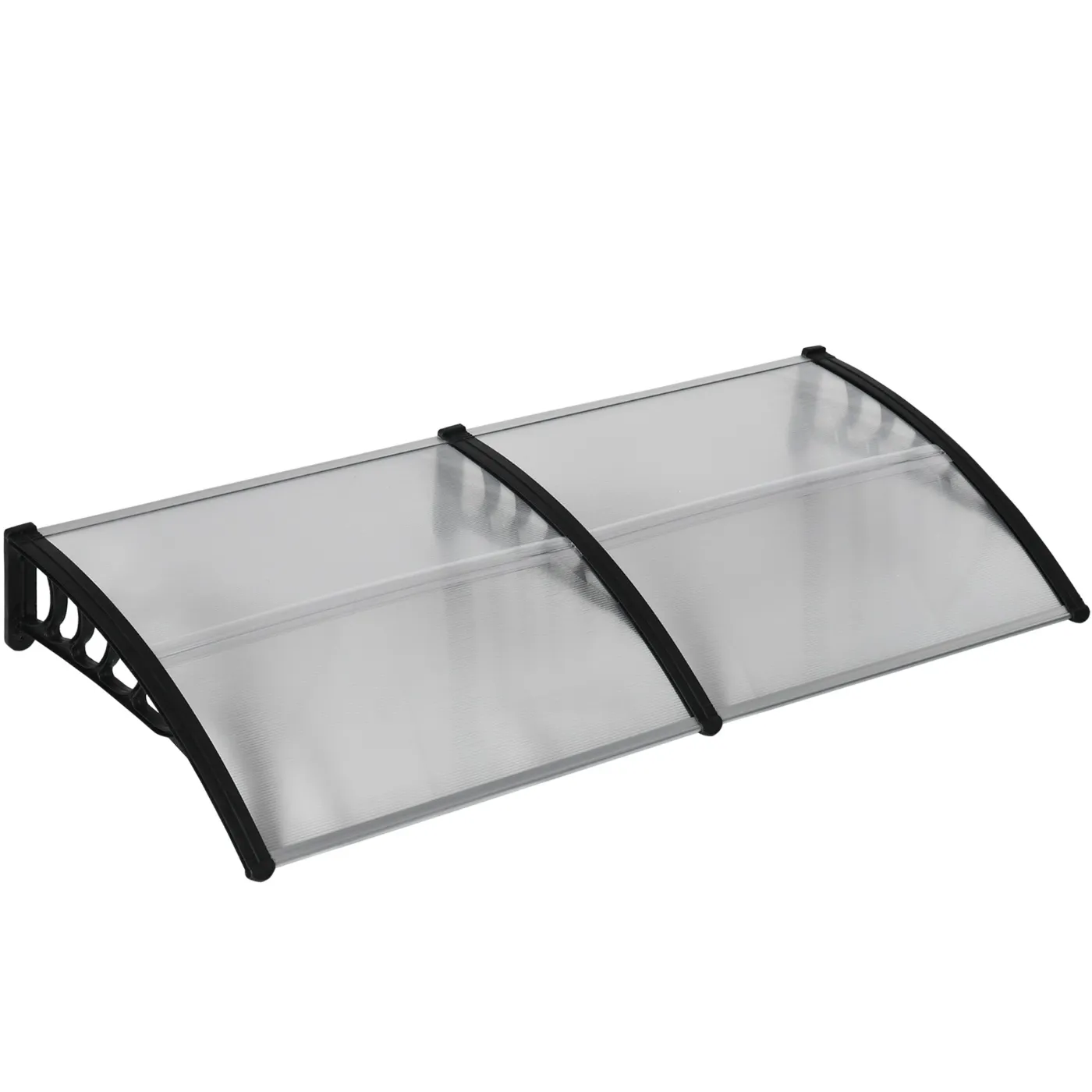 - RESISTANT: The side brackets for fixing to the wall are made of rigid PP plastic and are connected to the aluminum profiles of the polycarbonate panel ends. The canopy is also made up of 2 panels, joined by an H-shaped aluminum strip.