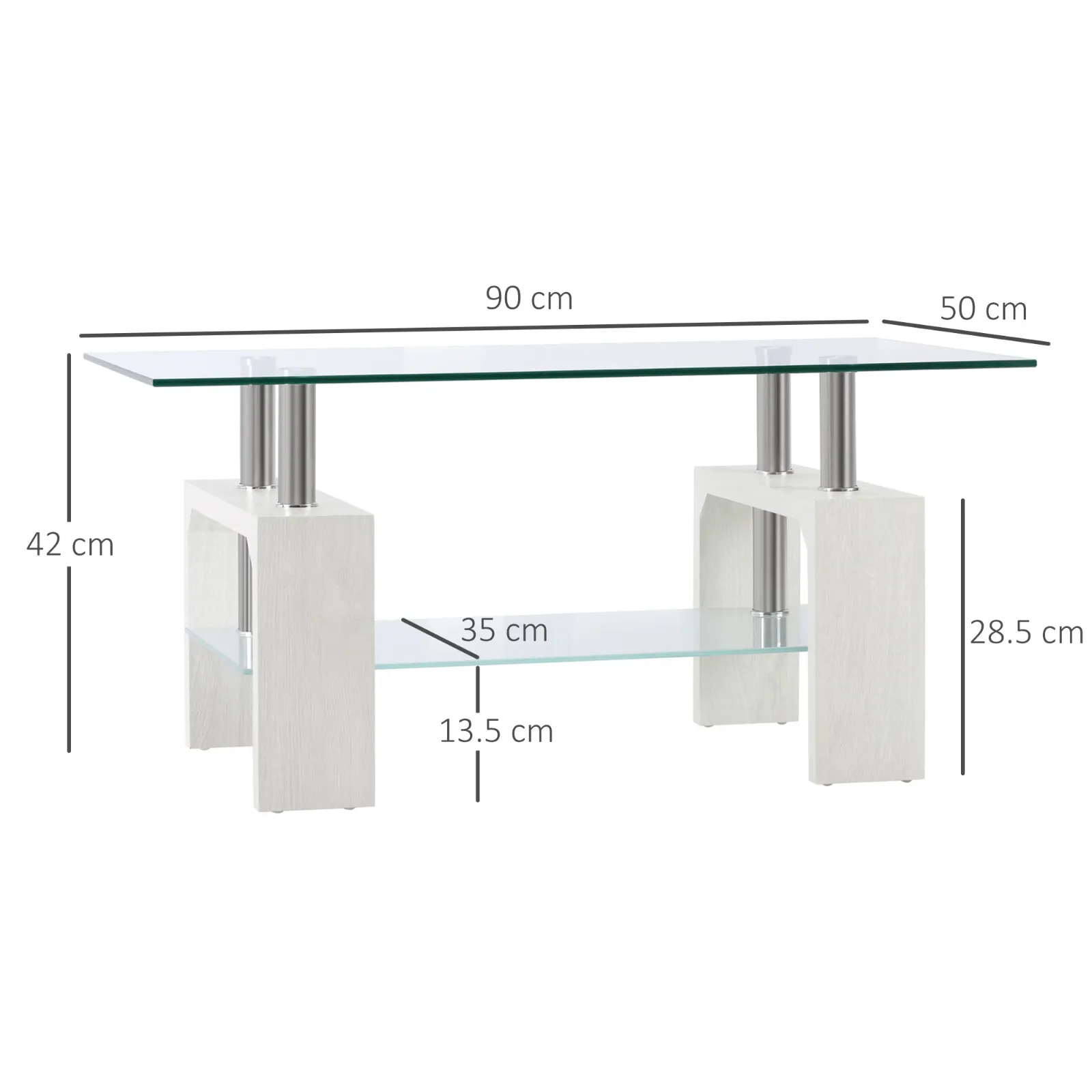 - • Color: transparent glass, white legs • Material: tempered glass, mdf, stainless steel • General dimensions: 90l x 50p x 42acm • Support plane size: 90l x 50pcm • lower shelf size: 70l x 35pcm • Distance from the ground: 13.5 cm • Height of the legs: 28.5 cm • Weight capacity: 60 kg (total), 30 kg (each shelf)