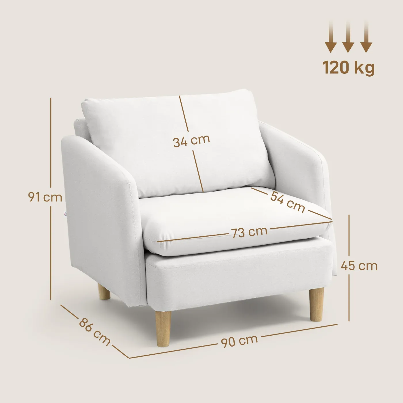 Modern Fabric Living Room Armchair with Wide Seat and Thick Padding, 90x86x91 cm, Cream