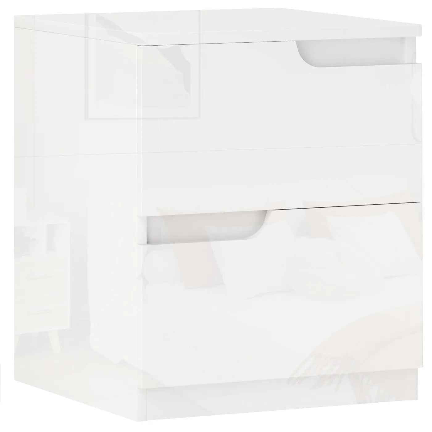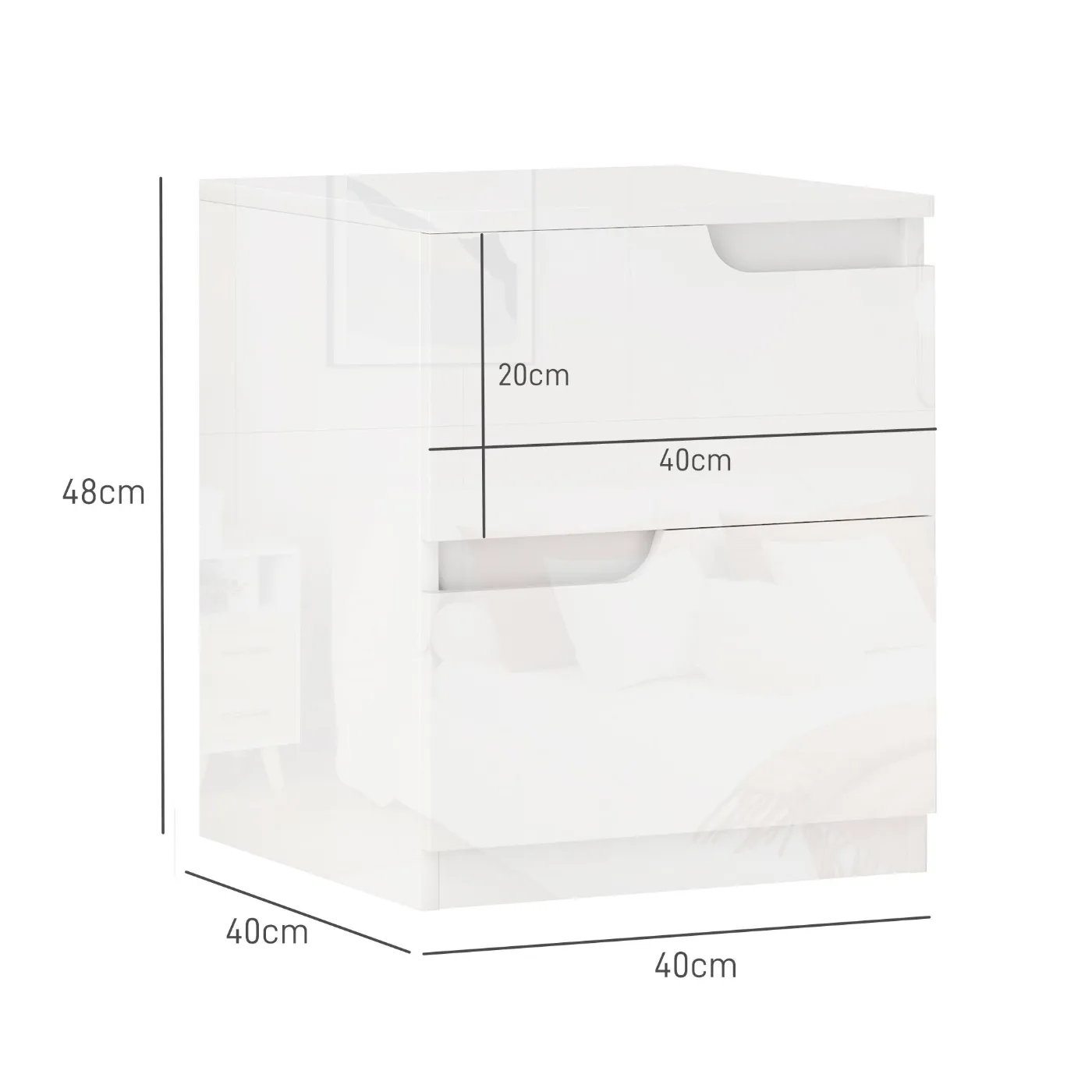 - • The glossy finish of the bedside table adds a touch of style to the bedroom