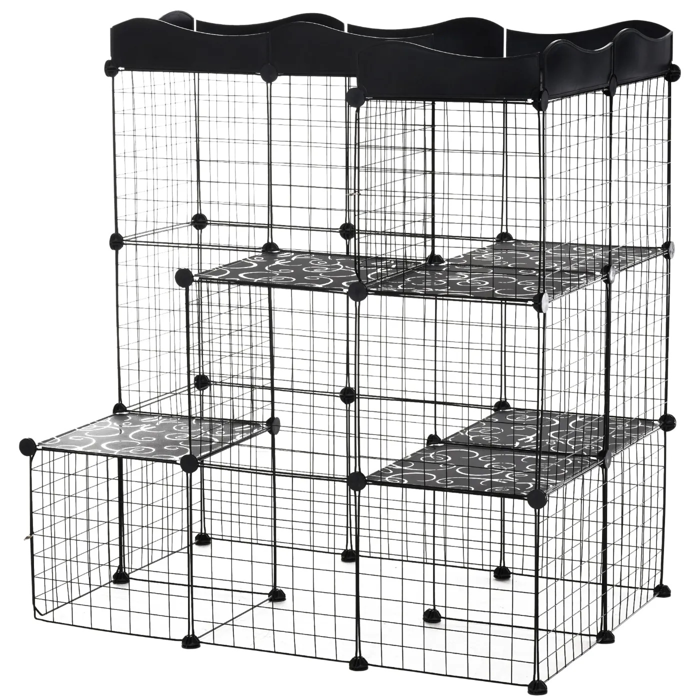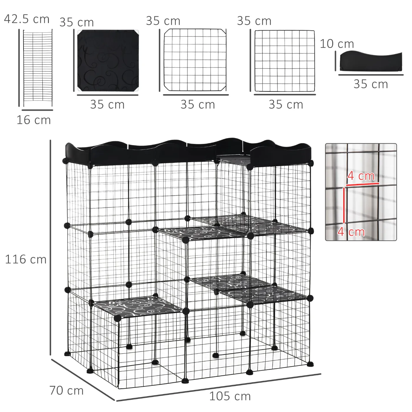 Our PawHut pet rabbit enclosure is the ideal shelter for cats and medium-sized rodents! The structure offers ample living space to run up and down the ramps and it is possible to assemble it in different shapes depending on the space needs and size of the animal. The wire run allows for fresh air and ensures pets don’t feel trapped, while the wide doors allow for easy feeding. Features: • Small pet run with modular panels for flexible space • Ideal for kittens and rabbits, not suitable for hamsters and rats • Non-slip feet and ties help secure the structure to the ground and prevent wobbling • The cat run keeps your pet safe, while providing more space for play and rest• The PP resin layers of the rabbit enclosure provide a suitable space for running and resting• 2 large lockable doors allow for easy entry and exit and increased security Technical data:• Color: Black• Material: Metal, PP• Overall dimensions: 105W x 70D x 116H cm• Door dimensions: 35W x 35D cm• Panel dimensions: 35L x 35D cm, 35W 35W x 35D cm, 35W x 10D cm • Ramp dimensions: 42.5W x 16D cm • Distance between nets: 4 cm • Weight capacity (single PP layer): 4.5 kg Package contents: • 34 x Metal panels • 10 x PP resin panels • 9 x Protective panels • 1 x Ramp • 47 x Plastic Connector• 1 x Cable Tie• 12 x Non-slip Feet• 1 x Hammer• 1 x Instruction Manual