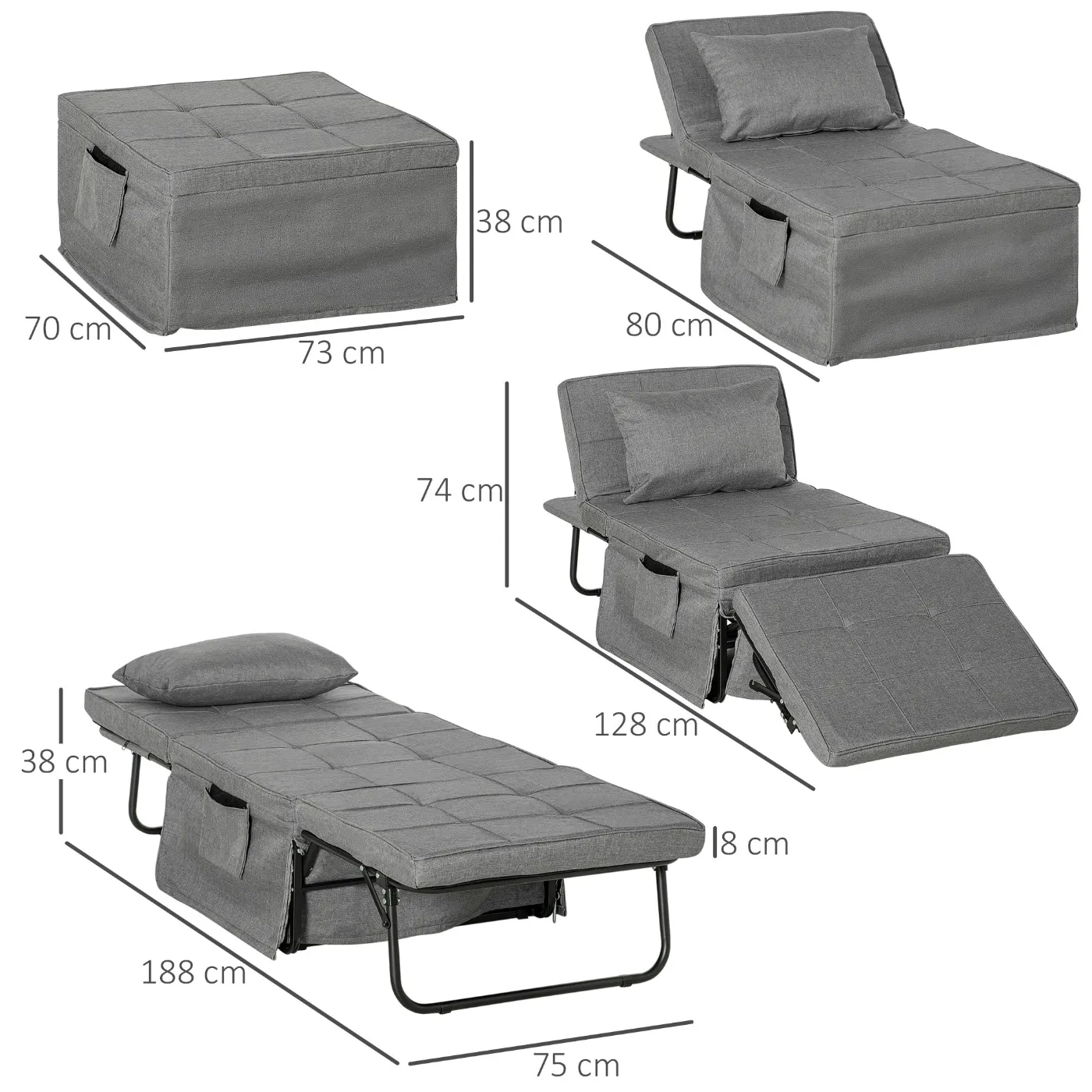 Do you have limited space in your living room and are looking for a multifunctional piece of furniture? This practical folding guest bed from HOMCOM is a true miracle of space and comfort! Equipped with an adjustable backrest and footrest, it transforms in an instant into a pouf, chaise longue, reclining armchair or bed. Thanks to the excellent balance between robustness and comfort, it can be used to welcome a guest for the night.