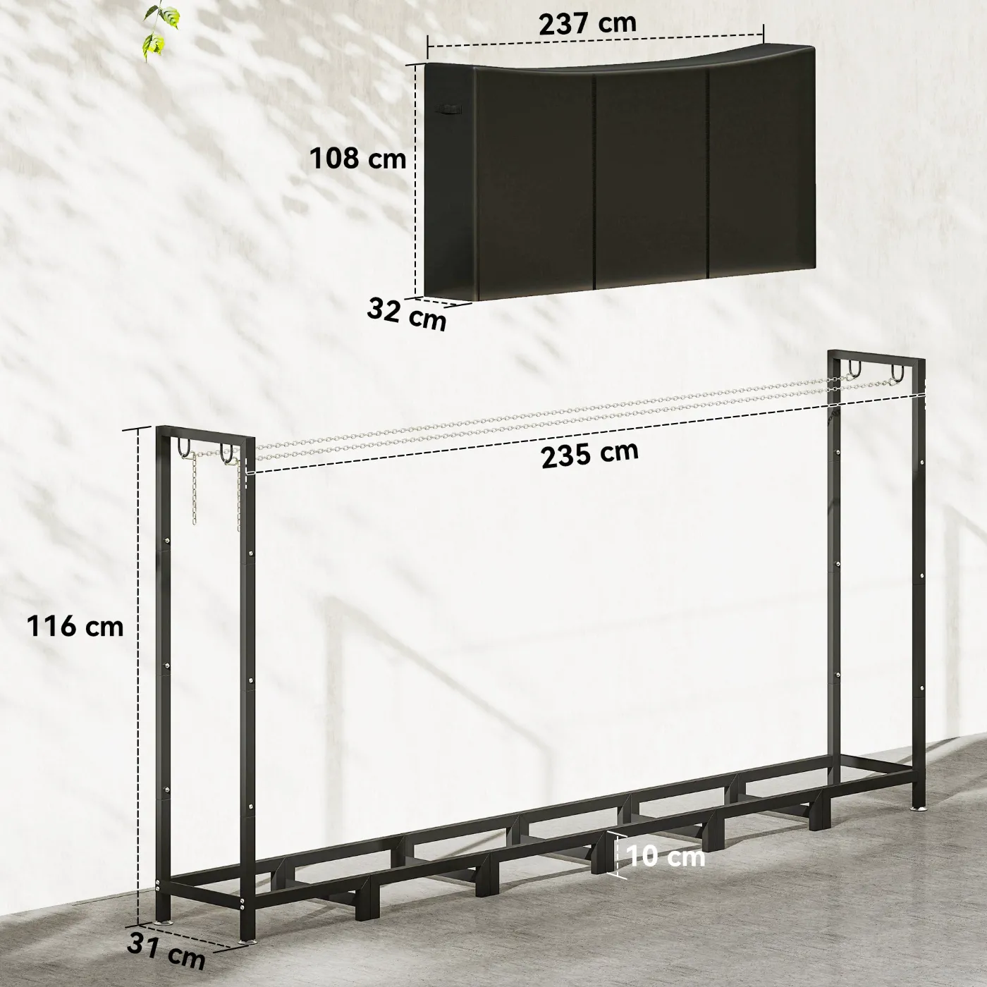 - LARGE CAPACITY: Measuring 235L x 31D x 116H cm, this sturdy log holder can hold up to 150kg of logs, covering all your log storage needs, whether you’re in the garden, garage or by the fireplace