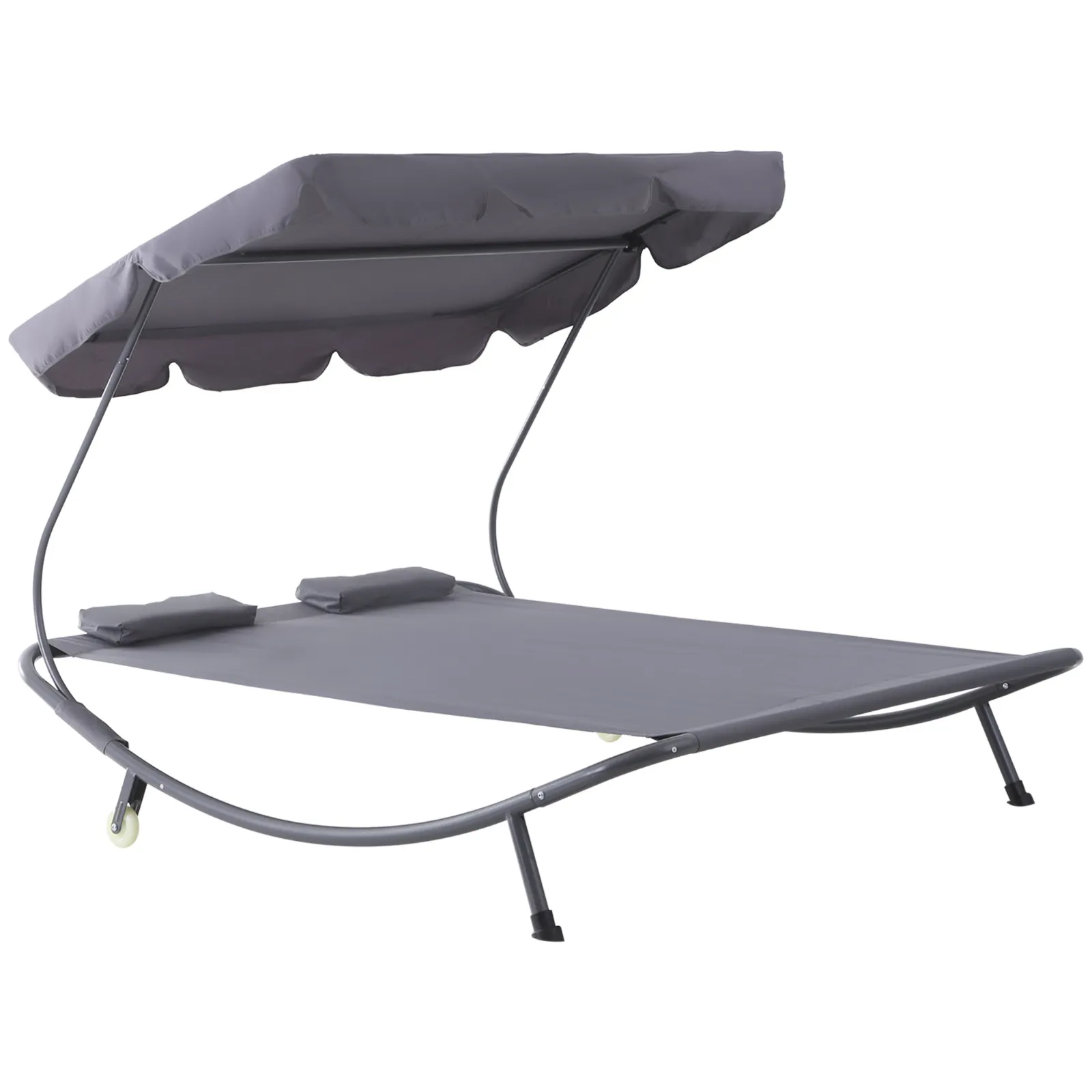 Stable and comfortable two-seater bed made of top quality breathable fabric! Its design with soft, modern and captivating lines makes it not only an excellent place to relax and sunbathe, but also a perfect piece of furniture to embellish your garden or terrace. It has a practical removable and angle-adjustable canopy for optimal protection from the sun. Easy to move thanks to the wheels.