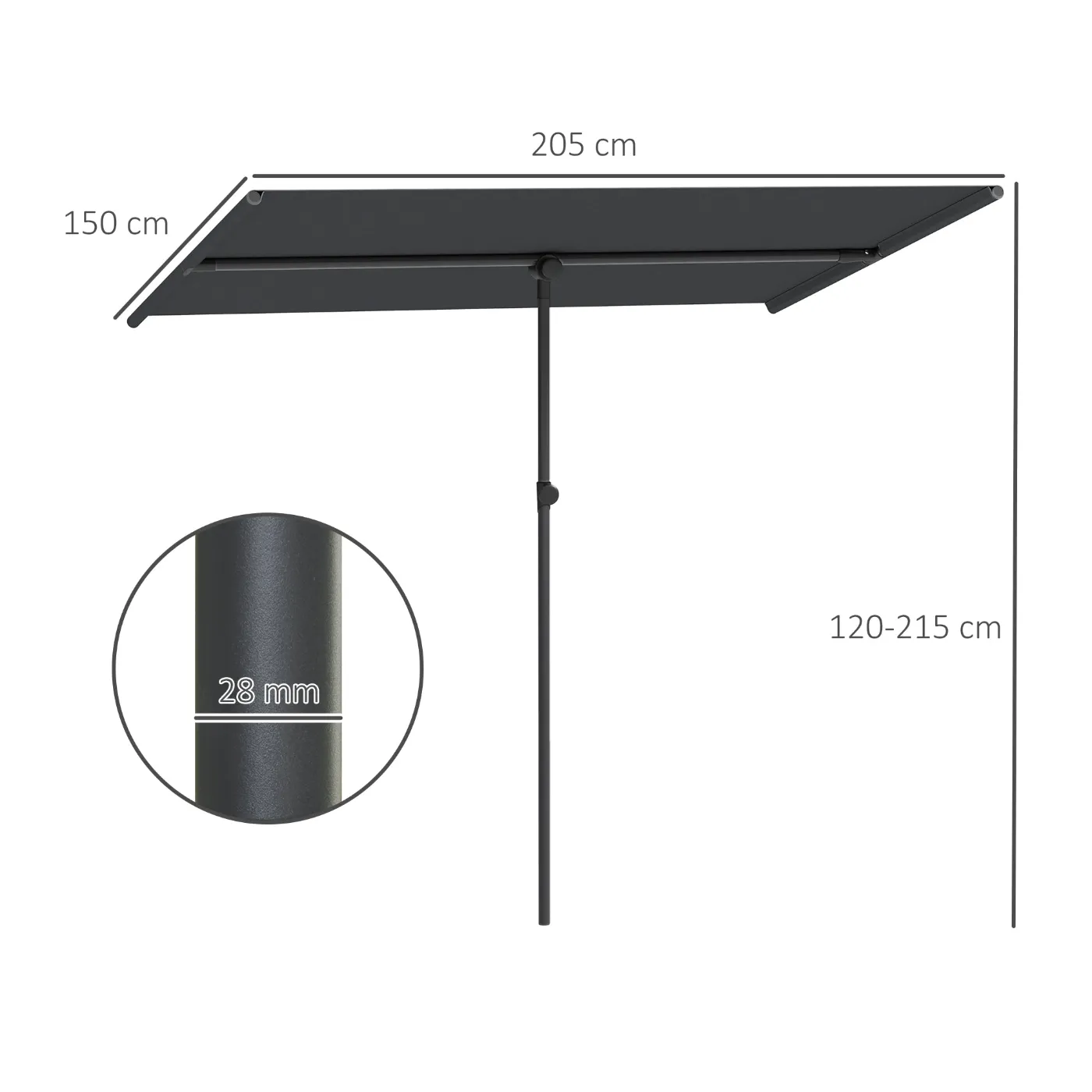 Discover the versatility of our 180° rotating Outsunny outdoor umbrella which guarantees maximum protection from the sun throughout the day. Adjust the height to find the ideal size in your outdoor environment. The polyester cover guarantees superior UV protection up to UV 50+, shielding 98% of UV rays, while the structure is made of aluminum to ensure prolonged stability.Features:• Our garden umbrella can rotate 180° to adjust the angle of exposure to the sun optimally• The height adjustment of this outdoor umbrella adapts to different spaces and needs• The polyester fabric of our outdoor umbrella offers UV protection 50+, blocking 98% of UV rays• The sturdy aluminum poles and single rib of this garden umbrella increase stability and durability• Metal components ensure durability for extended outdoor use• Assembly requiredTechnical data:• Color: Dark grey• Material: Fabric (100% polyester), aluminum• Overall dimensions: 150L x 205D x 120-215H cm• Pole dimensions: Ø28 mm, Ø32 mm• Upper rib dimensions: Ø28 mmPackage contents:• 1 x Garden umbrella• 1 x Assembly manual