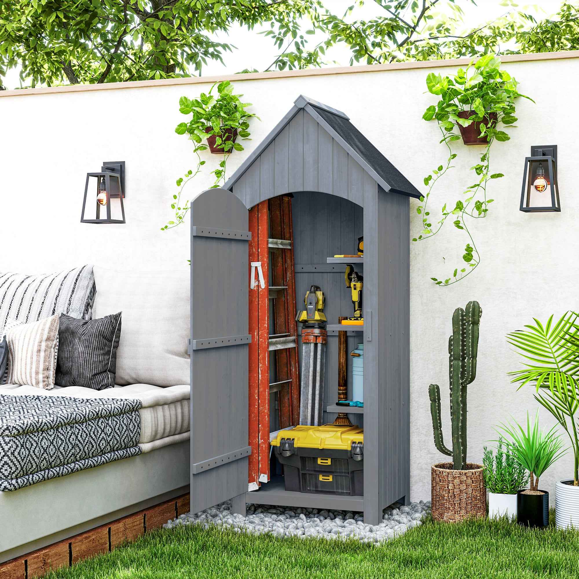Outsunny 3-Shelf Wooden Tool Shed with Waterproof Bitumen Roof, 77.5 x 54.2 x 179.5 cm, Grey