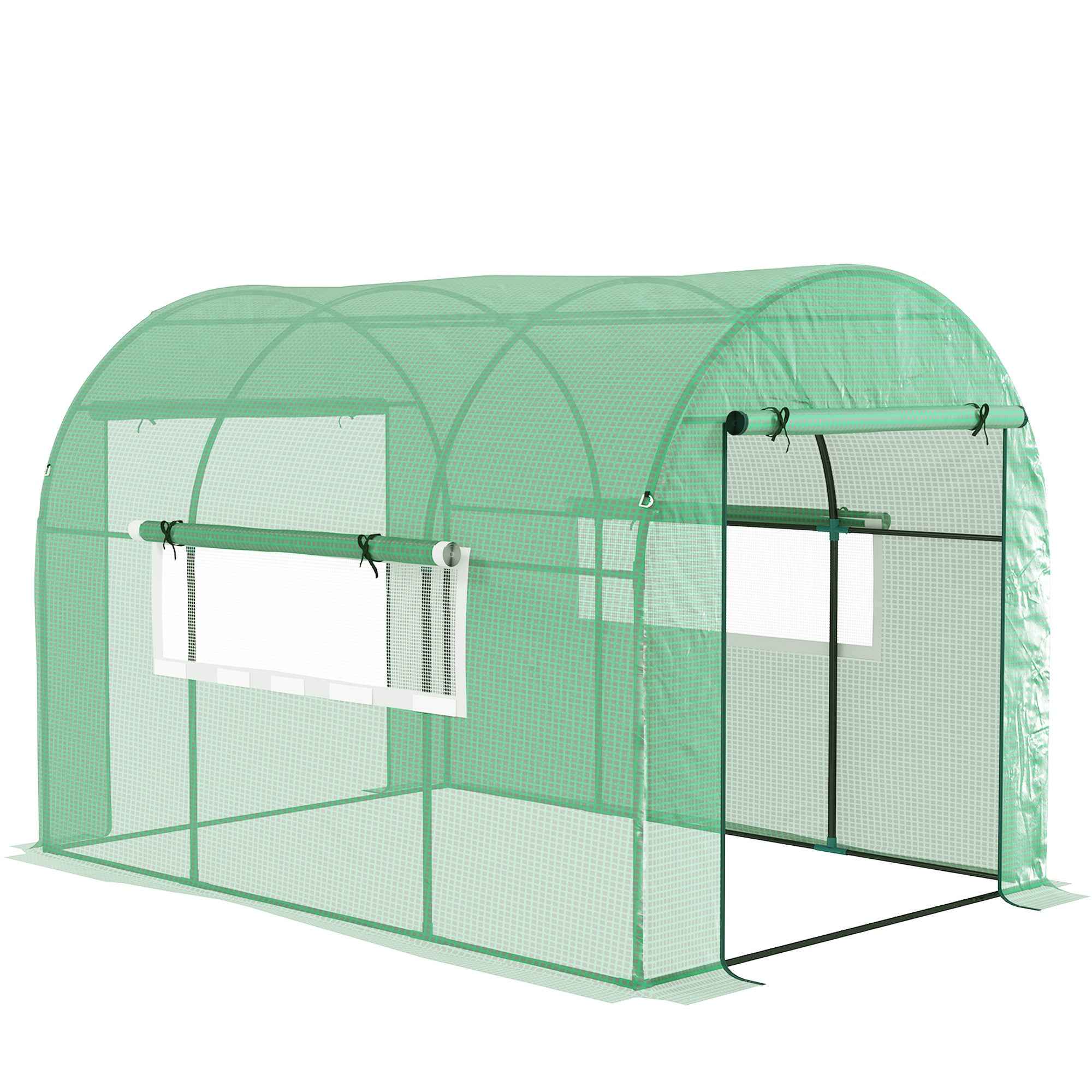 Grow your plants year-round with the Outsunny tunnel greenhouse. The PE cover helps maintain the internal temperature and ensures maximum light penetration for optimal plant growth. The garden greenhouse features roll-up doors with zippers for easy entry and exit. The screened windows ensure optimal ventilation and keep insects out. Don’t fear the bad weather and ensure your plants have a perfect environment to grow in! Features:• PE plant greenhouse cover that ensures optimal light passage and heat retention• Zippered doors and windows that facilitate access and air exchange inside• Arched roof that prevents water accumulation• Extended edges to be buried for greater stability• The package includes ground pegs and windproof ropes to securely fix the structure• Easy to assemble with plastic connectors• 2 people are required to assemble the vegetable garden greenhouseTechnical data:• Color: Green• Material: Steel, polyethylene• Overall dimensions: 300L x 200D x 200H cm• Door dimensions: 132D x 170H cm• Side window dimensions: 125D x 50H cm• Edge width: 10 cm• Wind resistance: Level 4 (wind speed less than 28 km/h)Package contents:• 1 x Greenhouse tunnel• 4 x Pegs• 4 x Windproof ropes