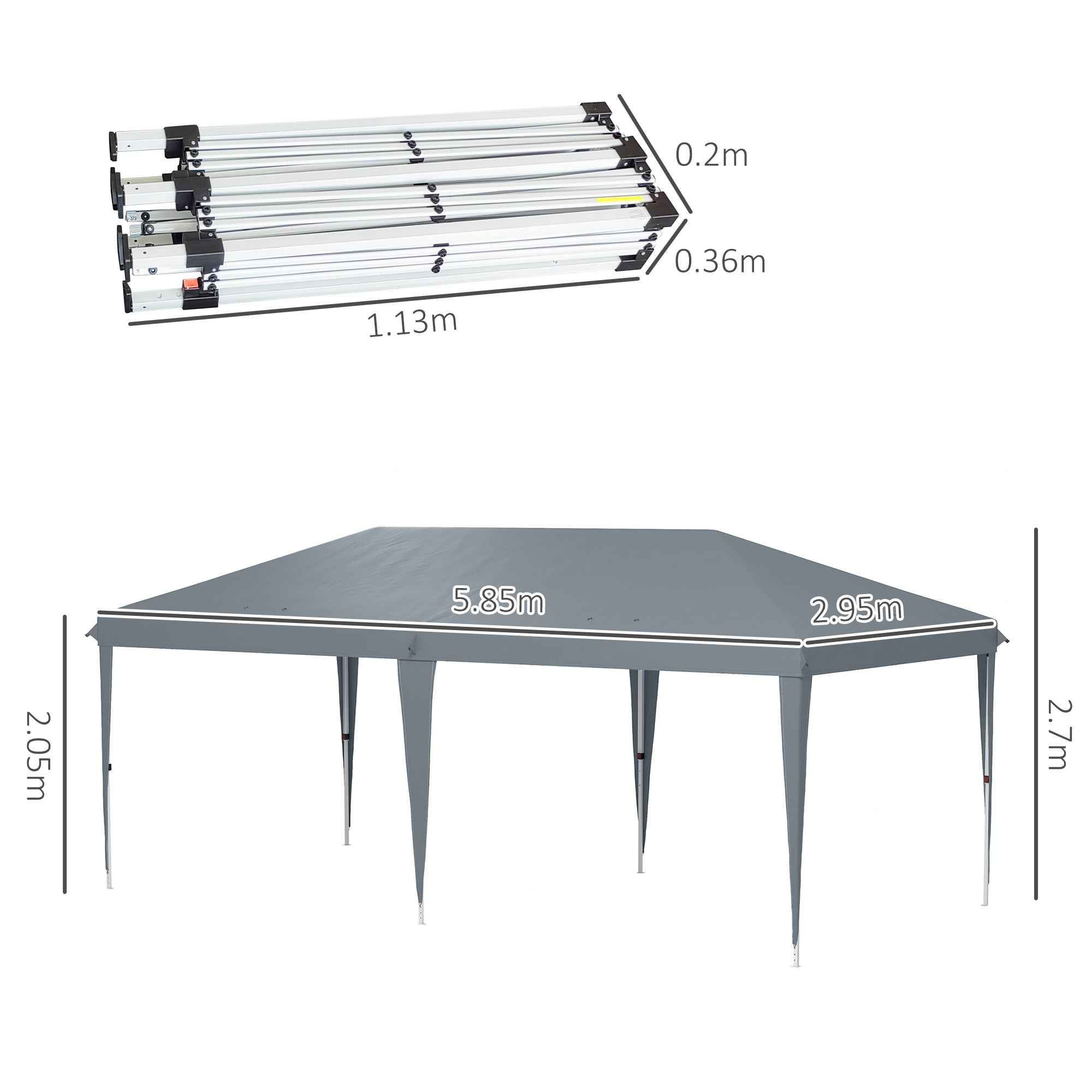 The Outsunny folding pop-up gazebo, constructed from corrosion-resistant epoxy steel and high-density 210D Oxford fabric, ensures optimal protection from UV rays. With a generous size of 5.85 x 2.95 m, our garden gazebo offers a large shaded area ideal for organizing garden lunches, markets, fairs and more. Features: • Ideal garden tent for organizing outdoor parties, picnics, participating in a market or fair • Automatic pop-up gazebo, folds and unfolds very easily, making it easy to use • Large party tent to accommodate many people at the same time • Easy to take wherever you want thanks to the included transport bag • Accessories included: 1 transport bag, 6 ropes and 12 ground anchor pegs • Recommended use: do not use the garden gazebo or leave it outside in adverse weather conditions (rain, wind, snow or hail) Technical data: • Color: Light gray • Material: Steel, high density Oxford polyester • Overall dimensions: 5.85L x 2.95D x 2.7H m • Folded dimensions: 36L x 20D x 113H cm• Height of the front part: 2.05 m• Diameter of the tubular feet: Ø30 mm / Ø25 mm• Length of the pegs: 16 cm• Length of the ropes: 3 mPackage contents:• 1 x Garden gazebo• 6 x Ropes• 12 x Ground anchoring pegs• 1 x Carrying bag• 1 x Manual