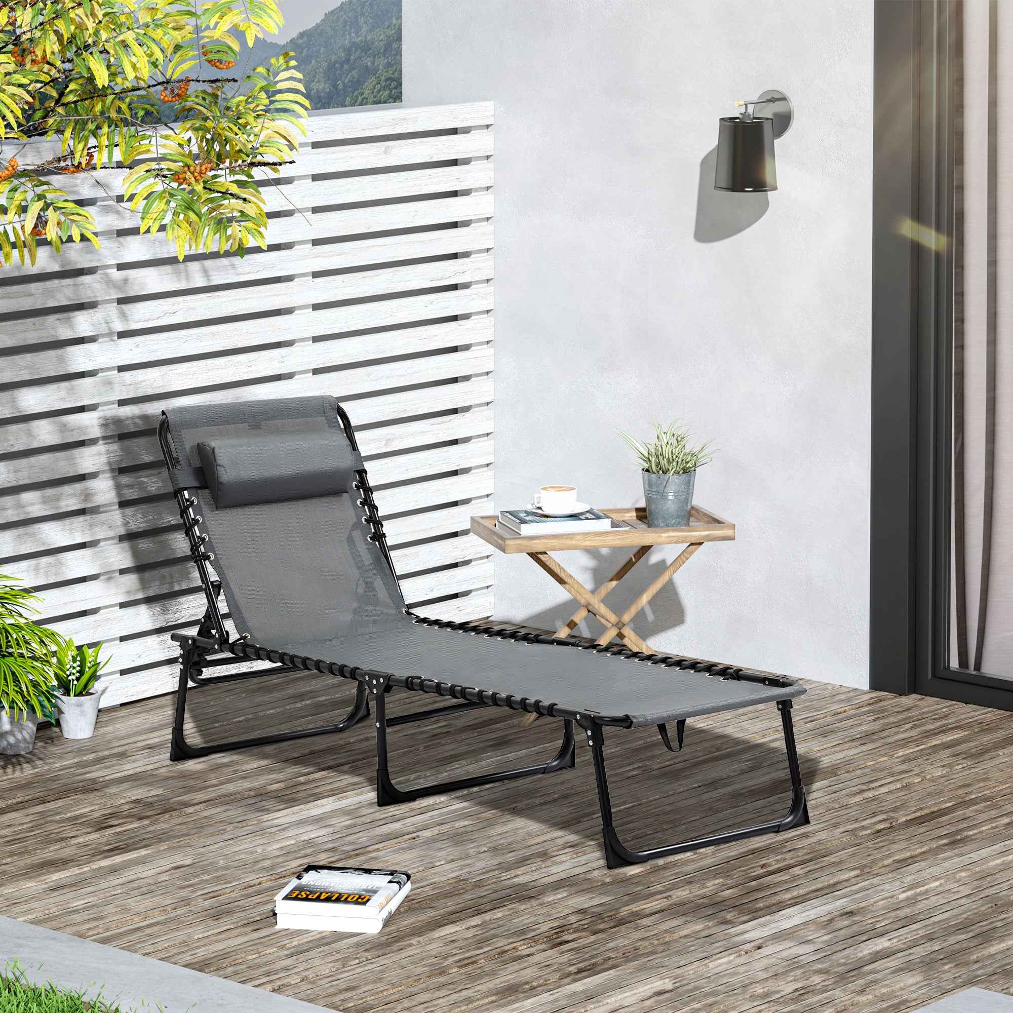 Outsunny Folding Garden Lounger with 5-Position Reclining Backrest and Cushion, 185x58x30cm, Grey