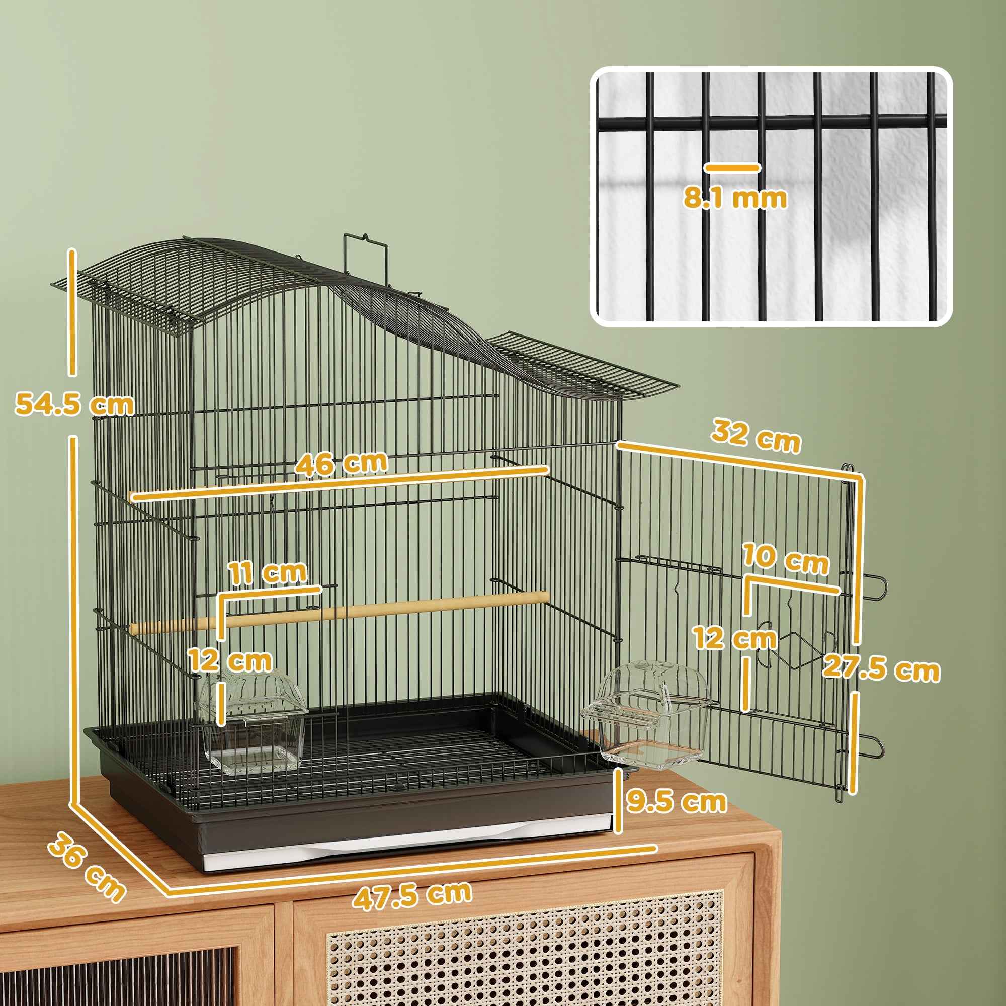 This PawHut bird cage makes everyday activities easier and provides a cozy and safe refuge for your feathered friends thanks to its innovative design. Multiple entrances make it easy to interact with the interior, while the sliding tray makes cleaning a breeze, so you can dedicate more love and time to your feathered friend. Features:• This bird cage includes 2 perches and 2 covered feeders to meet the needs of your feathered friends• Multiple doors offer easy access for cleaning and stress-free feeding of your birds• A removable bottom tray makes daily cleaning of the bird cage quick and totally effortless• The aviary’s 8.1 mm bar spacing is designed to keep birds safe inside• The ventilated design around the perimeter of the pet cage ensures a fresh and healthy living space• Simple and modern style that integrates perfectly with any decor• The structure can be assembled by one person in about 8 minutes Technical data:• Color: Black• Material: Metal, plastic• Overall dimensions: 47.5L x 36D x 54.5H cm• Main door dimensions: 32L x 27.5H cm• Dimensions of the Cup door: 10L x 12H cm• Side door dimensions: 11L x 12H cm• Perch dimensions: Ø1.5 x 46 cm• Bottom tray dimensions: 47.5L x 36D x 9.5H cm• Removable tray dimensions: 40.3L x 31D x 2.5H cm• Bowl dimensions: 9.5L x 10D x 8.5H cm• Distance between bars: 8.1 mmPackage contents:• 1 x Bird cage• 2 x Feeding bowls• 2 x Perches• 1 x Assembly manual