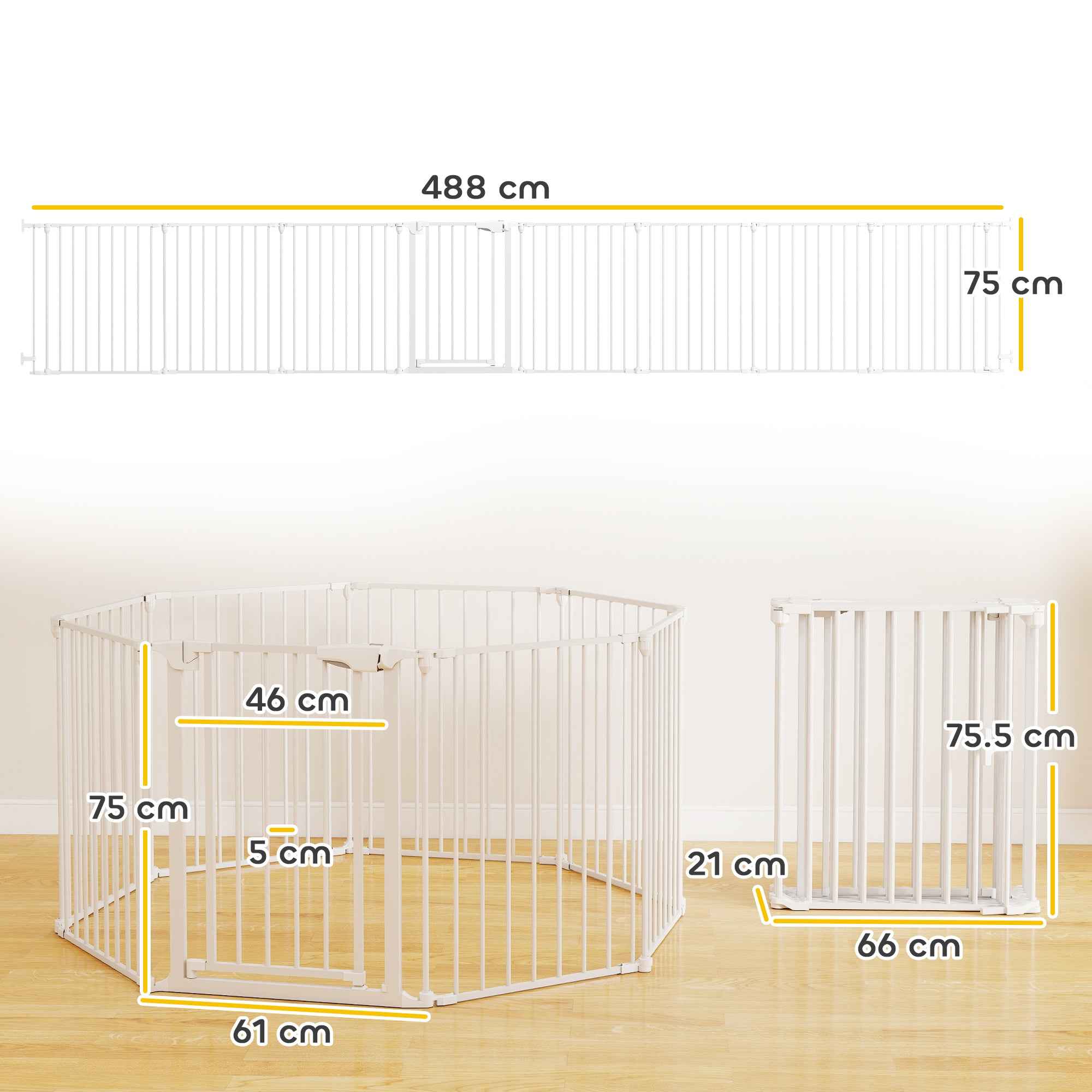 Anxiety about children and pets on the stairs or near the fireplace can be put aside with our PawHut dog gate to restore peace of mind. The sturdy, modular panels create safe barriers in every space of the house, while the gate can be opened with just one hand, ensuring easy entry and keeping everyone safe in the right places. Features:• Puppy playpen with 8 configurable panels, suitable for stairs, doorways or for safe play• Dog playpen constructed of sturdy carbon steel and non-slip feet for reliable stability• The easy-access door has a double lock and can be easily opened with one hand up to 180°, closing automatically for safety or remaining open for convenience• The 75 cm height and narrow bars of the child playpen prevent small and medium-sized animals from escaping• Smooth, rounded edges comply with safety standards EN71-3 and EN12227, ensuring safety for children• The structure folds into a compact size for easy storage under beds or sofas• Easy to assembleTechnical data:• Color: White• Material: Carbon steel, ABS• Overall dimensions: 61L x 3D x 75H cm• Passage width: 46W cm• Distance between doors: 62.5W cm• Folded dimensions: 66W x 21D x 75.5H cm• Space between bars: 5.7W cm• Safety standards: EN71-3, EN12227Package contents:• 1 x Dog run• 1 x Assembly manual