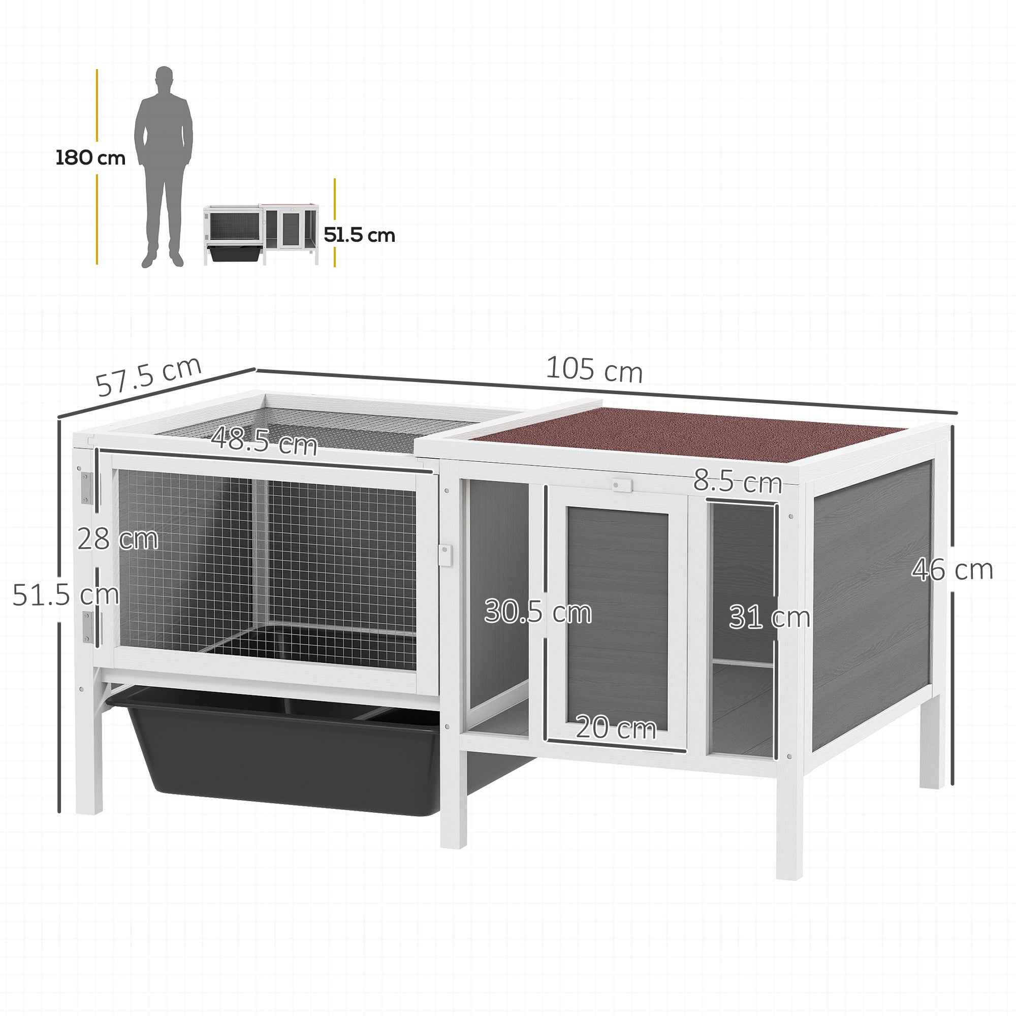 This PawHut rabbit hutch is the ideal home for all rodents that need a safe outdoor space where they can move and rest in peace. The structure is made of weather-resistant fir wood, with a spacious two-tier design and a removable tray for easy cleaning, ensuring a happy and safe environment for your pets and simplifying daily maintenance. Features:• Rabbit hutch with a private sleeping area connected to a large play area• Solid fir wood hutch with a waterproof bitumen roof for outdoor and indoor use• Deep removable tray included and opening roof for easy cleaning• Transparent windows allow you to easily observe and interact with your pets• The rabbit cage’s numerous doors provide easy access for feeding• Secure metal locks and dense wire mesh keep your pets safe inside• Cozy outdoor hutch to house rabbits, gerbils, hamsters and guinea pigs• Assembly requiredTechnical data:• Color: White, gray, brown• Material: Fir wood, metal, PET• Overall dimensions: 105L x 57.5D x 51.5H cm• Dimensions Main cage dimensions: 48.5L x 53.5D x 37H cm, 0.26㎡• Tray dimensions: 48.5L x 48.5D x 15H cm• Top door dimensions: 52L x 57.5D cm• Running cage dimensions: 51.5L x 53D x 49.5H cm, 0.29㎡• Cage door dimensions: 48.5L x 28H cm• Observation window: 8.5L x 31H cm• Internal access door dimensions: 15.5L x 25H cm• Internal ramp dimensions: 37L x 12D cm• External ramp dimensions: 30.5L x 20D cmPackage contents:• 1 x Rabbit hutch• 1 x Assembly manual