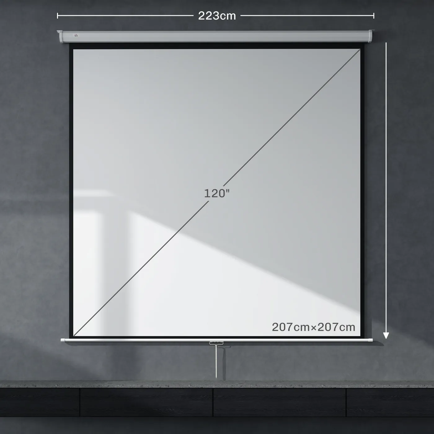 - DIMENSIONS: Overall dimensions: 223W x 8D x 223H cm. Projection screen suitable for indoor spaces. Assembly required
