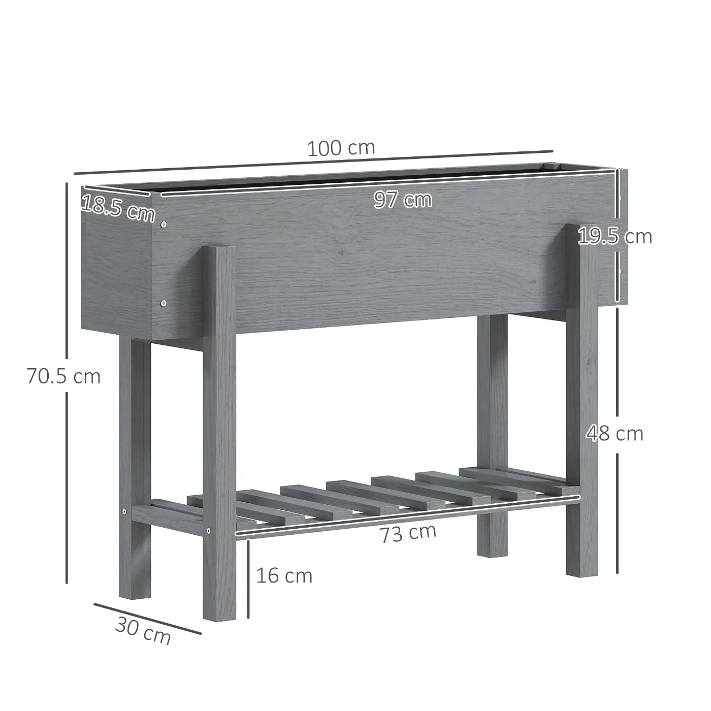 - DIMENSIONS: Product Dimensions: 100W x 30D x 70.5H cm. Internal Area Dimensions: 97W x 18.5D x 19.5H cm. Weight Capacity: 50 kg (planter), 25 kg (shelf). Assembly Required