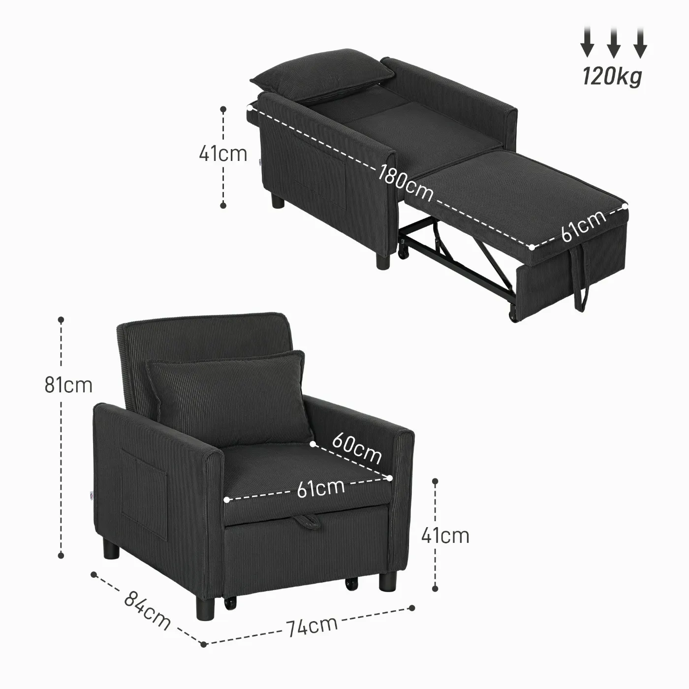 - CONVERTIBLE SEAT: This multifunctional bed chair can easily transform from a lounge chair or recliner into a comfortable temporary bed with a pull-out mechanism. Place this chair in your home, office or other space-constrained environment