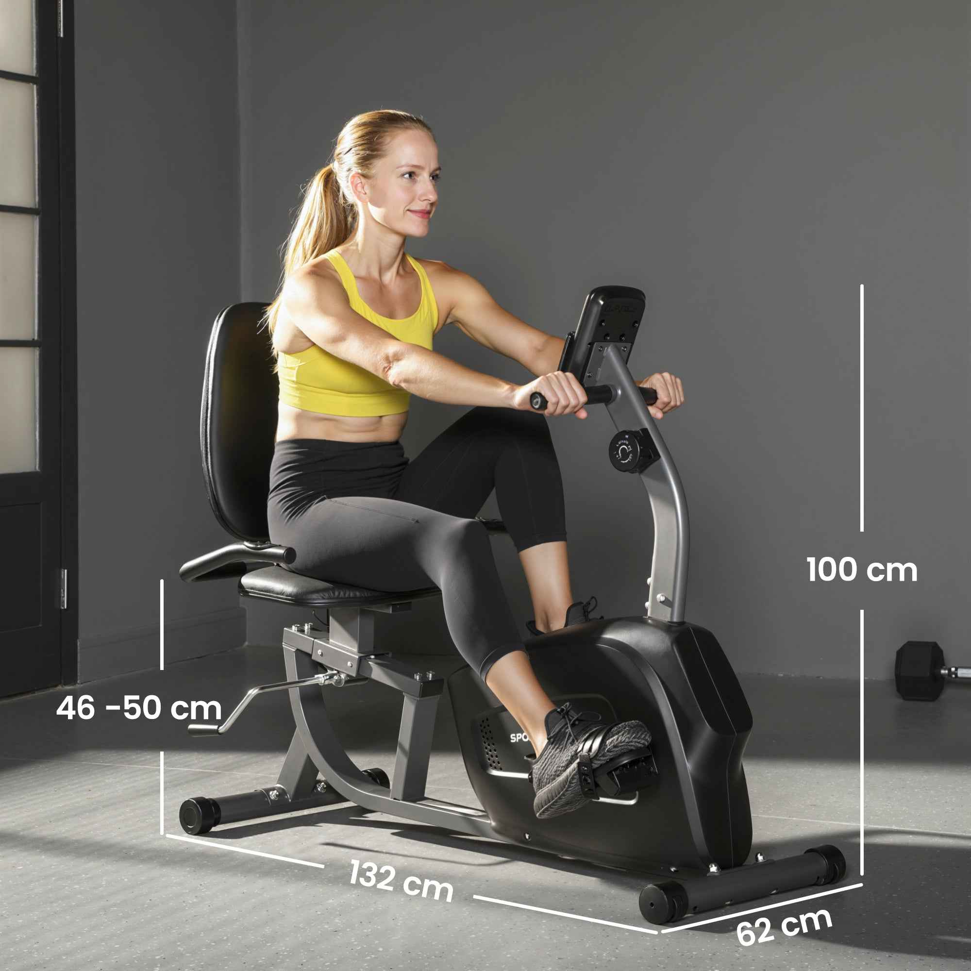 - ADJUSTABLE SEAT: The recumbent bike seat is adjustable in 4 directions, with a height of 46 to 50 cm and a forward/backward range of 16 cm. The padded cushion and backrest ensure comfort and proper alignment, reducing stress on the back and joints.