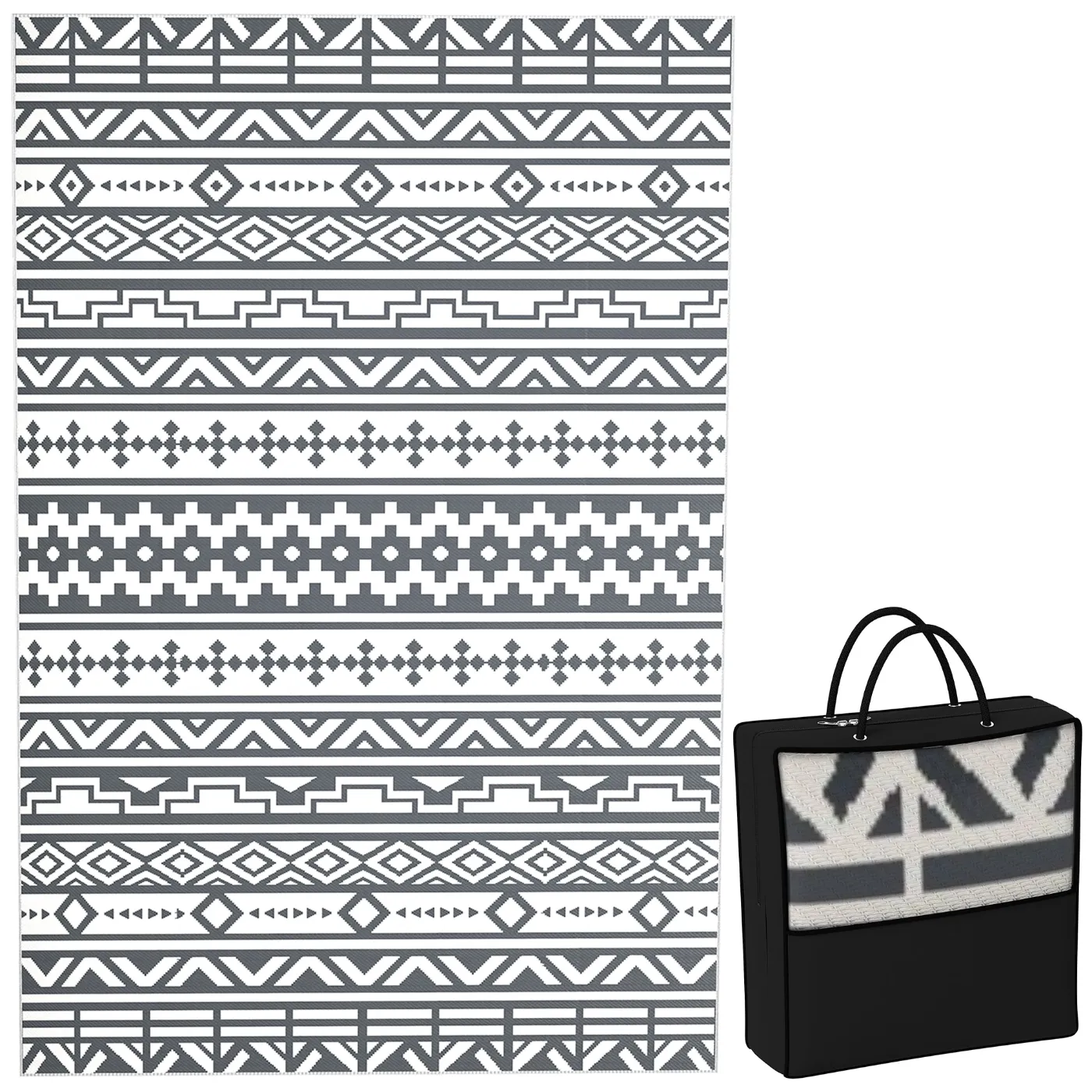 Decorate your outdoor spaces with the exclusive Outsunny outdoor rug. Designed to resist dirt, this outdoor rug cleans up in a snap – just sweep, spray, mop or shake. Polypropylene fibers stay dry and do not retain moisture. Perfect for the camper, it is also ideal for camping, beaches or picnics. With its reversible design, you can update the style by simply turning the rug.Features:• Reversible outdoor rug that allows you to change the pattern whenever you want• Versatile rug for use both indoors (patio, balcony) and outdoors (camping, park, etc.)• Made of polypropylene with a protective coating to prevent fading and sun damage• Garden rug made with sturdy edges to prevent fraying• Space-saving foldable design for easy storage and transport• Carrying bag included• Versatile for camping, picnics, camper road tours and moreTechnical data:• Color: Dark grey, white• Style: Geometric pattern• Material: Polypropylene 310g/m², non-woven fabric, plastic• Dimensions: 182W x 274D cm• Carrying bag dimensions: 39W x 37.5D x 15H cm• Note: Not fire retardant, keep away from firePackage Contents:• 1 x Outdoor Mat• 1 x Carrying Bag