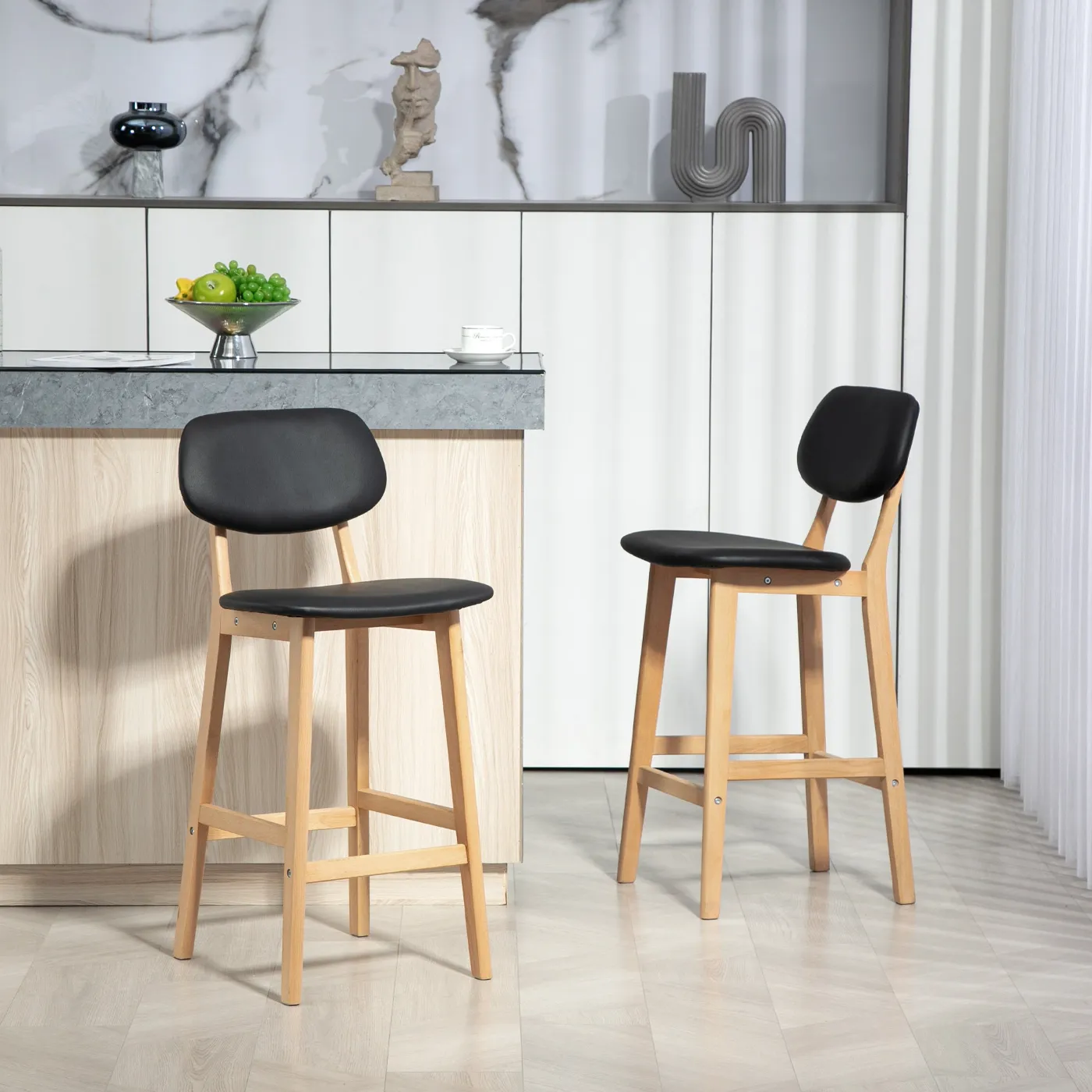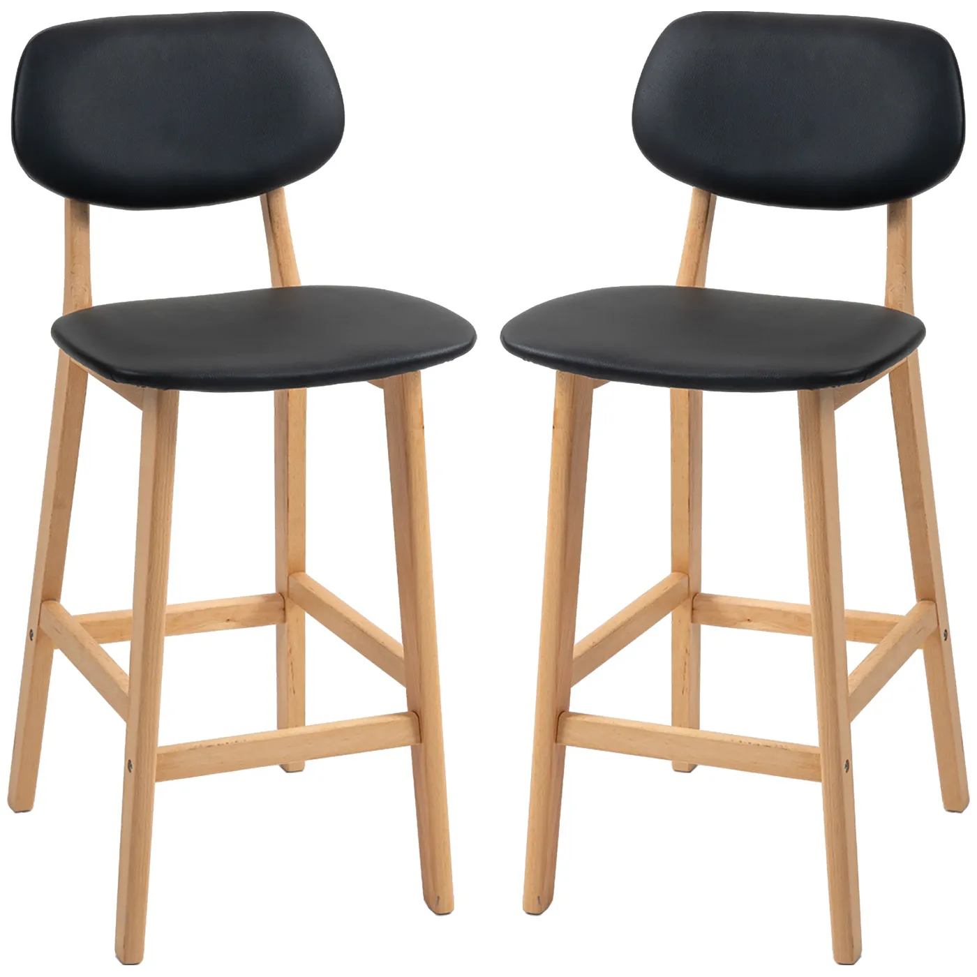 Optimize the space of your wet bar or dining area with this set of 2 modern high stools from HOMCOM. Covered in elegant imitation leather, they have a curved and padded seat, a footrest and backrest to ensure maximum comfort at all times. With a solid wooden frame and non-slip feet, each kitchen stool ensures durability and functionality without sacrificing style. Features:• Set of 2 bar stools, perfect for matching any high counter• Faux leather upholstery for an elegant look• Curved and padded seat for superior comfort • High stools with footrest for optimal support • Wooden frame ensuring long life and stability • Integrated anti-slip and anti-scratch feet • Assembly required Technical data: • Colour: Black, natural wood • Material: Faux leather PU, beech wood• Overall dimensions: 42W x 47D x 92H cm• Seat dimensions: 42W x 36D cm• Seat height: 65cm• Backrest dimensions: 38.5W x 27.5H cm• Suitable counter height: 89-99 cm• Weight capacity: 120 kgPackage contents:• 2 x Bar stools• 1 x Manual