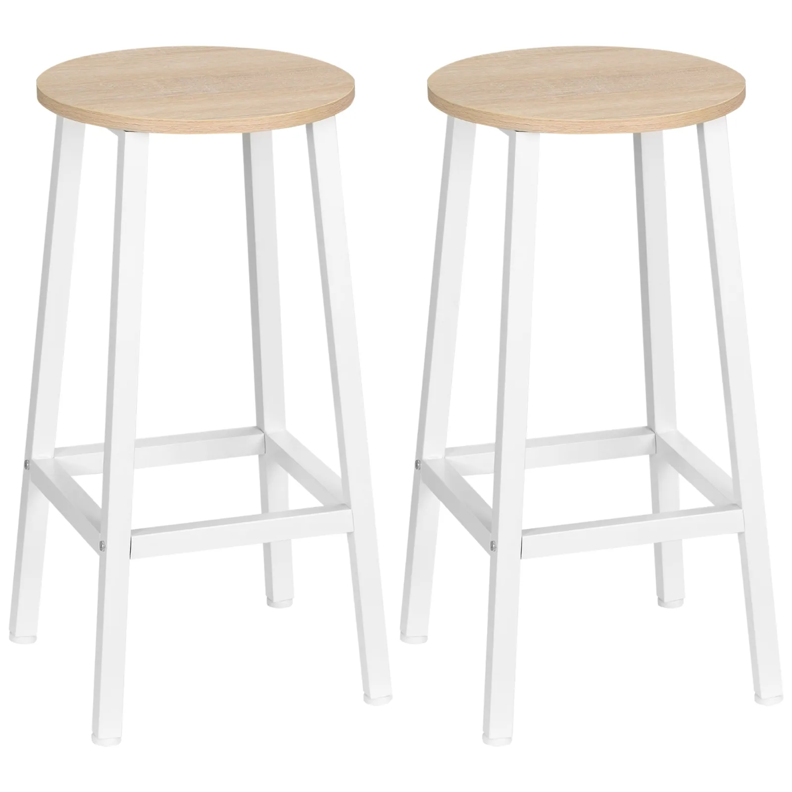 Set of 2 Kitchen Stools in Chipboard and Steel with Smooth Top and Footrest, 32.5×32.5×65 cm, White and Wood