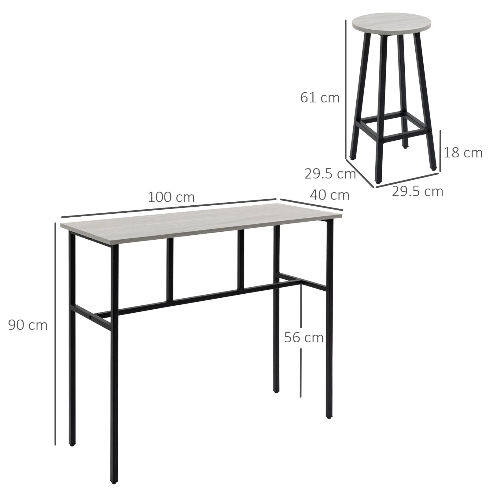 Transforms a small space into an inviting dining room. With the 6 -piece Homcom bar set, you can create a welcoming place to share many good moments in company. The tables can be positioned against a wall or they can also be united to make guests sit around and have them entertained. The bar stools can be combined to save some living space in the house. Carabetrics: • the tables that can be positioned against a wall or united together • stools can be positioned under the table • Trucked top for easy cleaning, steel structure Increase robustness and stability • Ideal for bar areas, dining rooms, kitchens and where the space is limited • Assembly required technical: • color: gray • material: chipboard panel, steel • overall size: 100l x 40p x 90acm (table), 29.5L x 29.5p x 61acm (stool) • Weight capacity: 60kg (table), 120kg (stool) Content of the package: • 2 x high tables • 4 x bar stools • 1 x instructions
