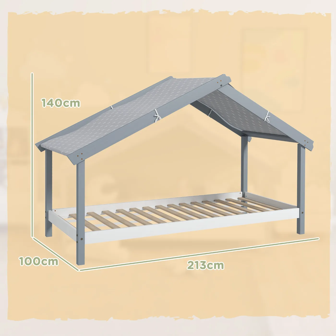 - • The decorative star-print fabric roof of the children’s bed allows you to hang curtains, lights or ornaments