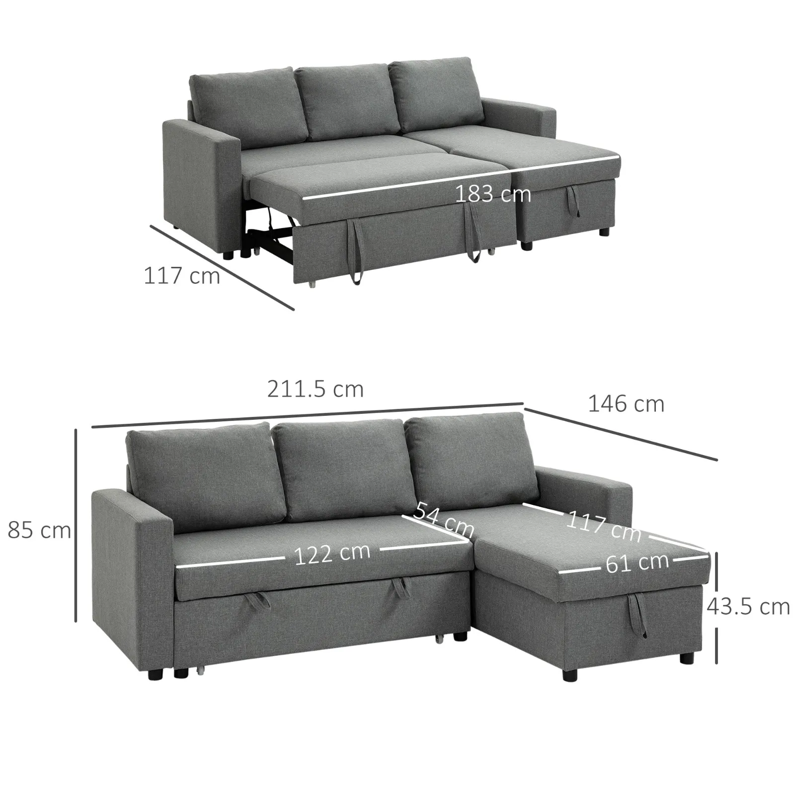 – General dimensions: 211.5L x 146p x 85acm (sofa mode), 183L x 117p x 43.5acm (bed)